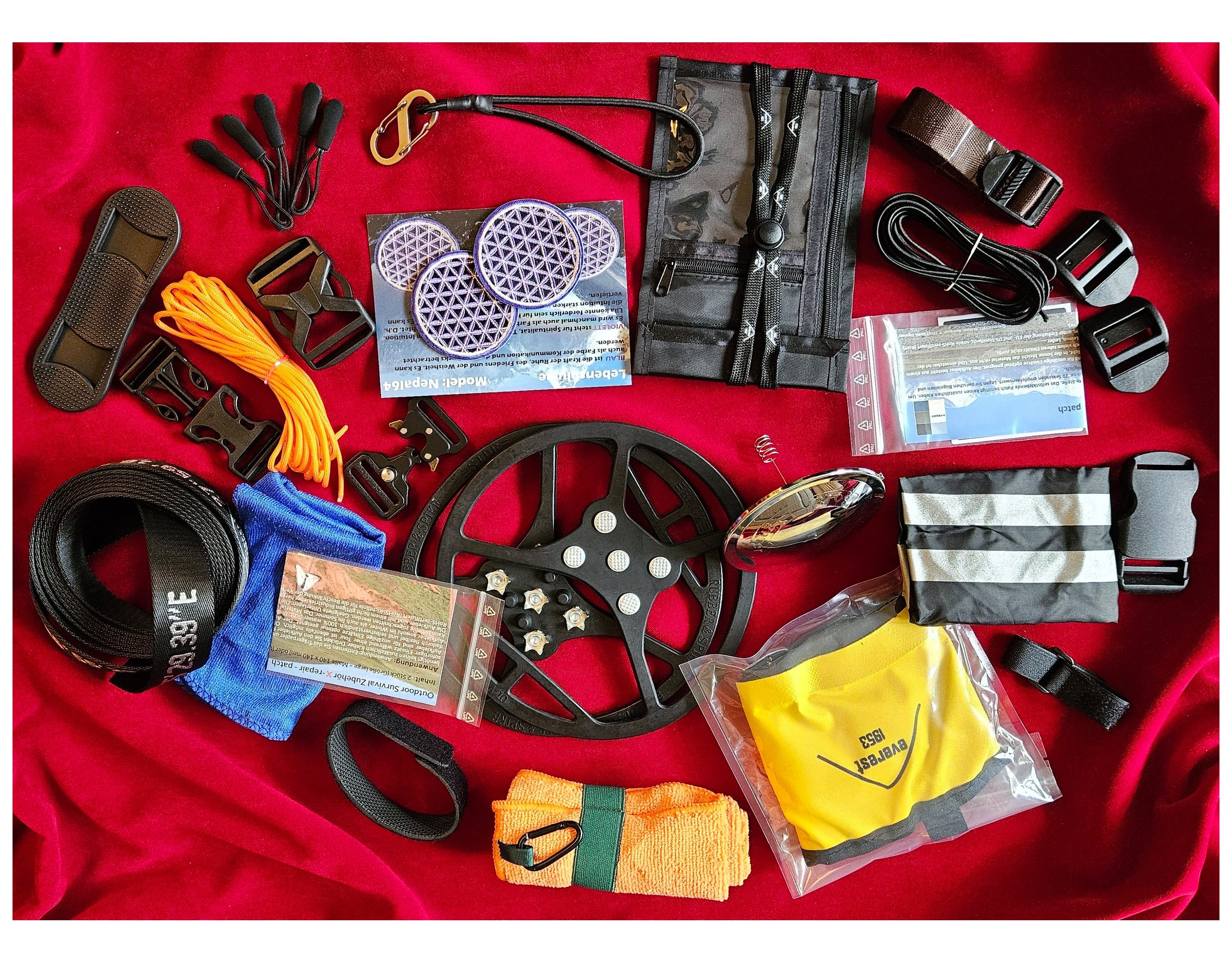 Inhaltsstoffe | Handtuch Microfaser schnelltrocknend 30 x 30 cm, Faltschüssel 5 Liter, 2,5 Meter Flachband Zurband mit Mount Everest 32 mm breit, 2 Nepal Aufbügler Blume des Lebens – Ruhe-Frieden, Schuhspikes Antirutsch Schuhkrallen Gripper, 3,5 Meter Gummiseil /Zeltstangengummi etc., 2 x Nylon Reparaturpads schwarz, selbstklebend Karabiner mit elastischem Seil um Spannung zu halten, 5 Meter Schnur orange, Regenabdeckung Fahrradhelm, 2 x TPU transparente Reparaturpads, Outdoor-Handtuch 40 x 40 cm mit Karabiner, Steckschnalle für Reisekoffer etc. bis 32 mm, 5 x B100 Reißverschlußanhänger schwarz larze-Size, VX-Ersatzsteckschnalle bis 38 mm für Rücksack, Tasche, Zugband… , V4-Ersatzsteckschnalle bis 32 mm für Rücksack, Tasche, Zugband… ,Taktische Schnellspannschnall, Gürtel Schnalle aus Metall 2 x Schnellspanner für Gurtband bis 32 mm, Klettverschluß-Binder, Brustbeutel schwarz mit Reißverschluß und Klasichtfach, Elastomer Schulterpolster für Tasche oder Gurtband bis 32 mm, Kompressionsgurt 120 cm, 25 mm breit Angelruten-Klett-Strap, Solar-Feuerzeug |
