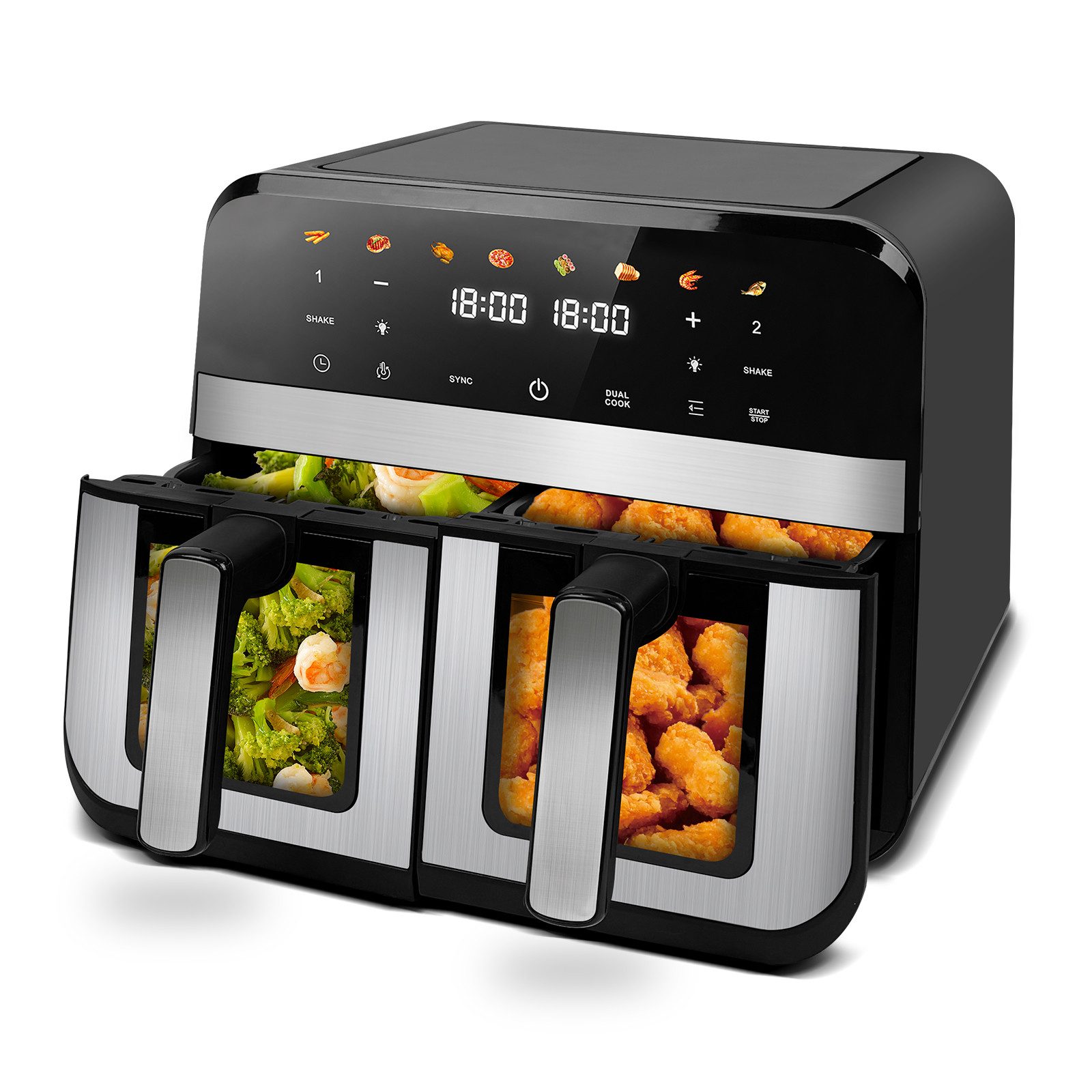 Top-Features | 9 L Fassungsvermögen, 8 Funktionen(Pommes frites, Steak, Flügel, Hähnchen, Garnele, Speck, Pizza, Kuchen), Spülmaschinenfeste Teile |