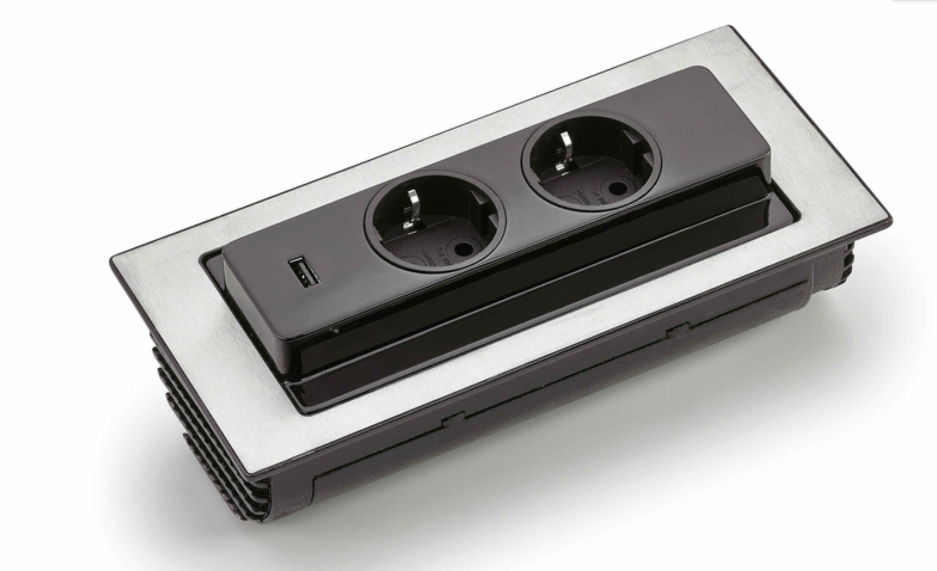 Immer verfügbar, aber nie im Weg. Geschlossen ist EVOline Backflip nur eine dünne Platte auf der Arbeitsfläche. Mit einem Finger angetippt dreht er sich um 180 Grad und zeigt seine nützliche Seite: USB-Charger und Steckdosen liegen so hoch über der Platte, dass sie vor Wasser geschützt sind. Die Einbautiefe beträgt dennoch nur 53 Millimeter, so dass auch eine Montage über Schubladen oder Geräten möglich ist.