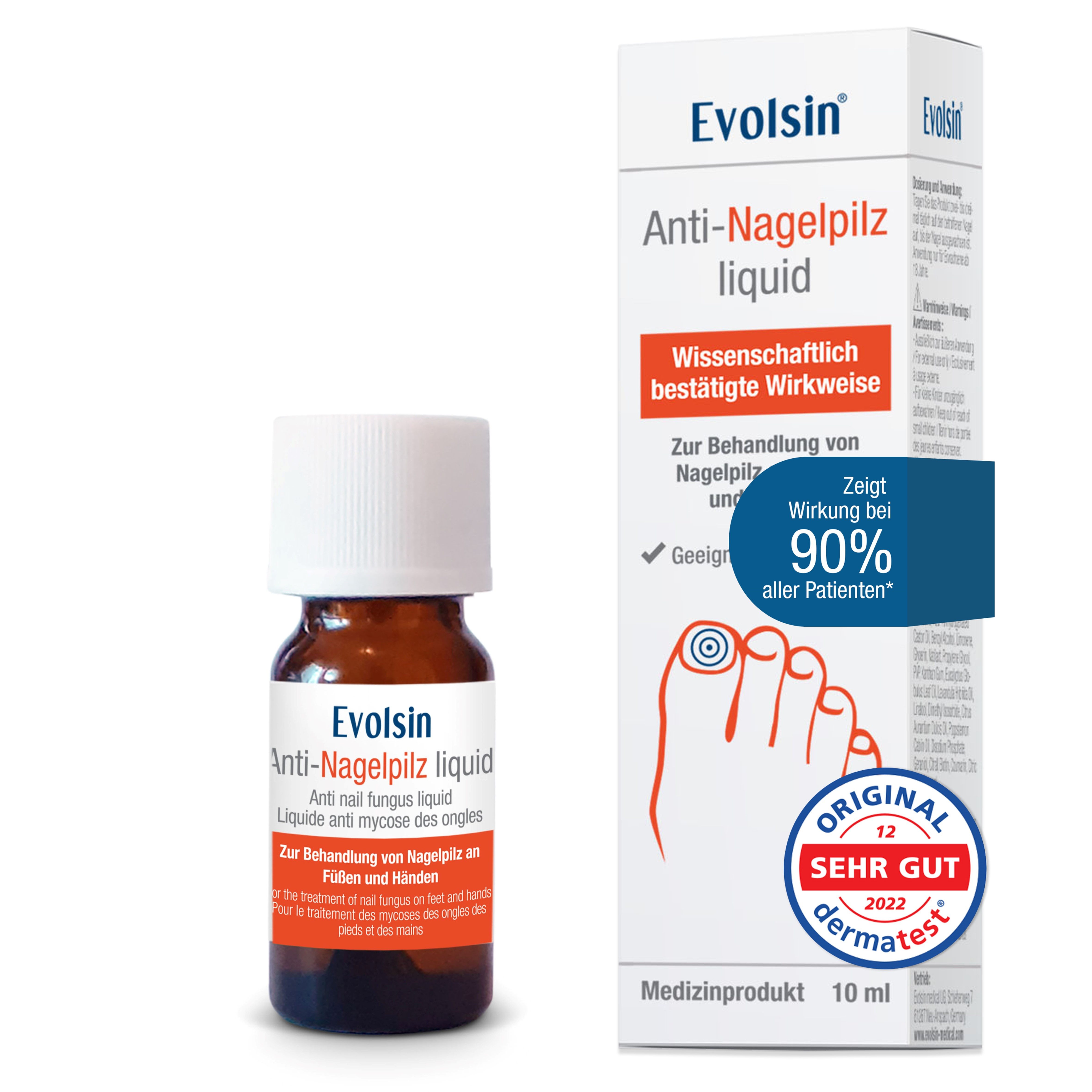 EVOLSIN@ ANTI NAGELPILZ LIQUID ist ein Medizinprodukt, das die Behandlung von Nagelpilz (Onychomycose) unterstützt. Sie hat sich bewährt und wirkt effektiv gegen Pilze, die Nagelpilz verursachen.* *Basierend auf In-vitro-Tests zur antimykotischen Wirksamkeit, die an Tricho-phyton rubrum, Trichophyton mentagrophytes, Epidermophyton floccosum und Candida albicans durchgeführt wurden. Um schneller ein besseres Ergebnis zu erzielen, wird empfohlen, den Nagel einmal in der Woche sorgfältig abzufeilen. Sobald die Behandlung gestoppt wird, tritt der Nagelpilz schneller wieder auf. Daher ist es wichtig, EVOLSIN® ANTI NAGELPILZ LIQUID weiterhin anzuwenden, bis der Nagelpilz ganz verschwunden ist. Da Nagelpilzinfektionen u.a. durch eine feuchte Umgebung entstehen können, wird dringend empfohlen, Socken aus 100% feuchtigkeitsabsorbierenden Materialien wie Baumwolle oder Wolle zu tragen. Dies ist wichtig, da die Pilze Feuchtigkeit lieben und sich unter diesen Bedingungen vermehren. Bei Nagelpilz ist es wichtig, dass die Füße immer trocken sind.