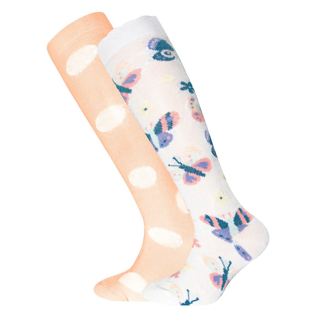 2er Pack Mädchen Kniestrümpfe Schmetterlinge Punkte von Ewers Kniestrümpfe im 2er Pack, Stahlblau/rosa oder Latte/peach, praktisches Doppelpack mit Schmetterlingen und Punkten in optimaler und bequemer Passform, hochwertige Verarbeitung, strapazierfähiges und pflegeleichtes Material, schönes Doppelpack