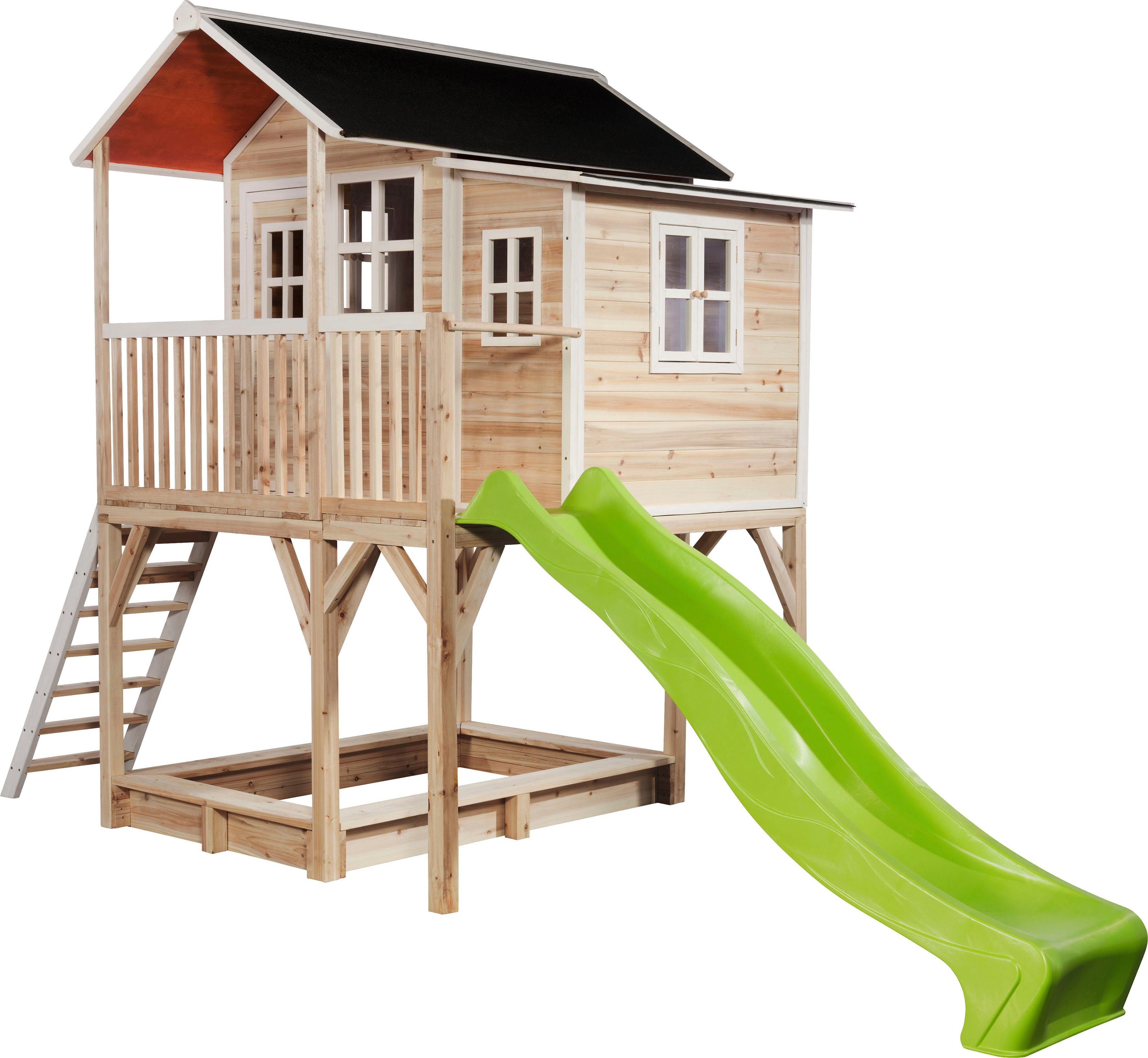 Piraten auf hoher See, Prinzessinnen im Turm, Mama-Papa-Kind-Spiele: Das Spielhaus »Loft 750« regt die Fantasie von Kindern an und ermuntert sie dazu, Geschichten und Abenteuer zu erfinden. Das Spielhaus auf Stelzen hat eine echte Veranda, von der die größeren Kinder mit der Rutschbahn wieder nach unten rutschen, währen die Kleinen unten im Sandkasten spielen. Mit seinen hübschen Naturfarben, den vielen Fenstern und der geräumigen Tür ist dieses fantasievolle Spielhäuschen der Traum für jedes Kind ab 3 Jahren.