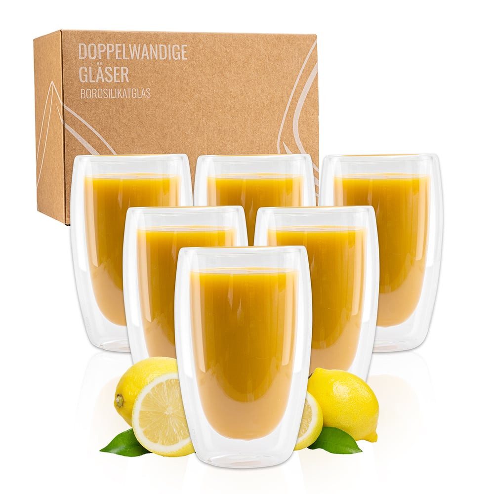 Genieße dein Getränk mit Stil! Ob Latte Macchiato, Kaffee, Softdrinks, Bier, Tee oder Kakao: Die doppelwandigen Latte Macchiato Gläser von EXITOSO im 6er-Set halten dein Lieblingsgetränk schön warm oder erfrischend kühl! Mit dem Fassungsvermögen von je 450 ml verbinden die Gläser elegantes Design mit praktischer Funktionalität und bieten viel Platz für dein Lieblingsgetränk.
