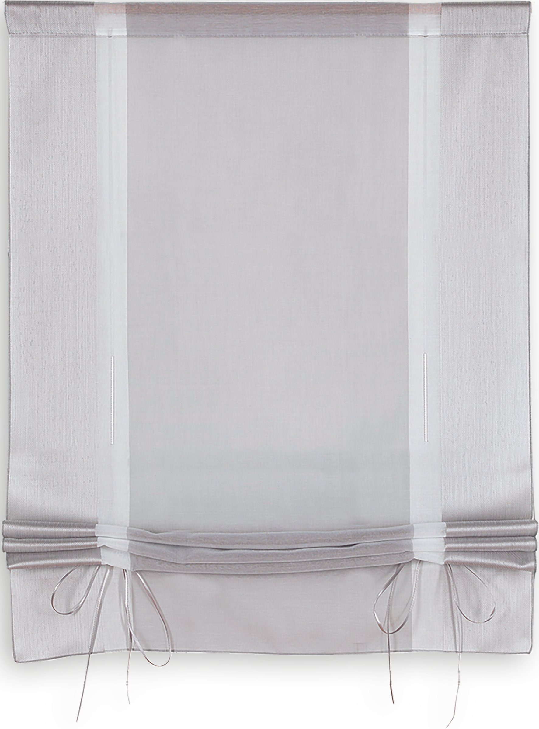 Diese Scheibengardine besteht aus weichem Batist in Grau, halbtransparent. Die seitlich äußeren Streifen der Küchengardine sind in einem silber grauen Dekostoff, blickdicht. Die Raffgardine kann mit 2 schönen Satinbändern gerafft werden auf die gwünschte Höhe. Das Raffrollo ist passend Перейти к товару Ösenscheibengardine 2248 05. Das Bändchenrollo hat oben eine Schaube auch Tunnel genannt und wird auf eine Stilgarnitur bis 12mm Durchmesser oder auf eine handelsübliche Ausziehstange gezogen. Seitlich senkrecht je 1 Band mit einem Stopper um eine gleichmäßige Raffung in der gewünschten Höhe zu bekommen. Ganz einfach ohne Vorkentnisse mit wenigen Griffen dekoriert und mittels instalierten Stopper, einfach auf die gewünschte Höhe festzustellen. Wenn man die 2 Stopper an den Bändchen löst, und herunterzieht, ist das Bändchenraffrollo glatt ohne Raffung. Unten als Abschluss befindet sich ein kleiner Saum für eine Beschwerungsstange. Das Bändchenrollo in transparent mit Beschwerungsstange ist fertig genäht und leicht zu montieren, entweder auf eine Stilgarnitur bis 12mm Durchmesser oder auf eine einfache ausziehbare Scheibengardinenstange Spannstange. Gerne dekoriert im Kinderzimmer, Küche, Büro aber auch im Wohnzimmer oder Eßzimmer.