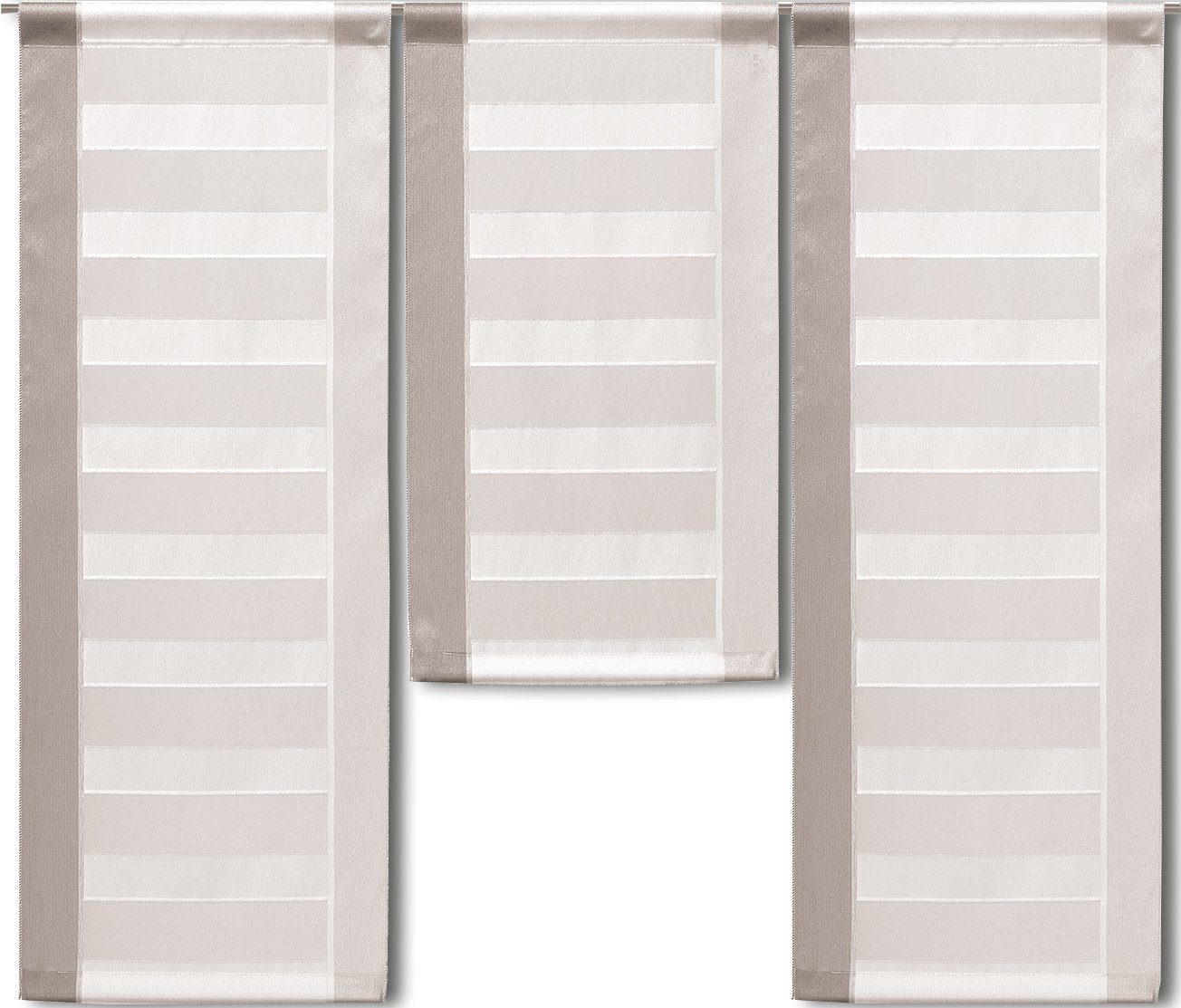 Hinweis Dekoration | Eine Schiebegardine ist eine schmale, glatt hängende Stoffbahn, die sich sowohl als Sichtschutz als auch zur Raumteilung eignet. Durch die Schiebetechnik sind Schiebegardinen sehr flexibel einsetzbar. Die angegebenen Maße sind die fertig dekorierten Maße. |