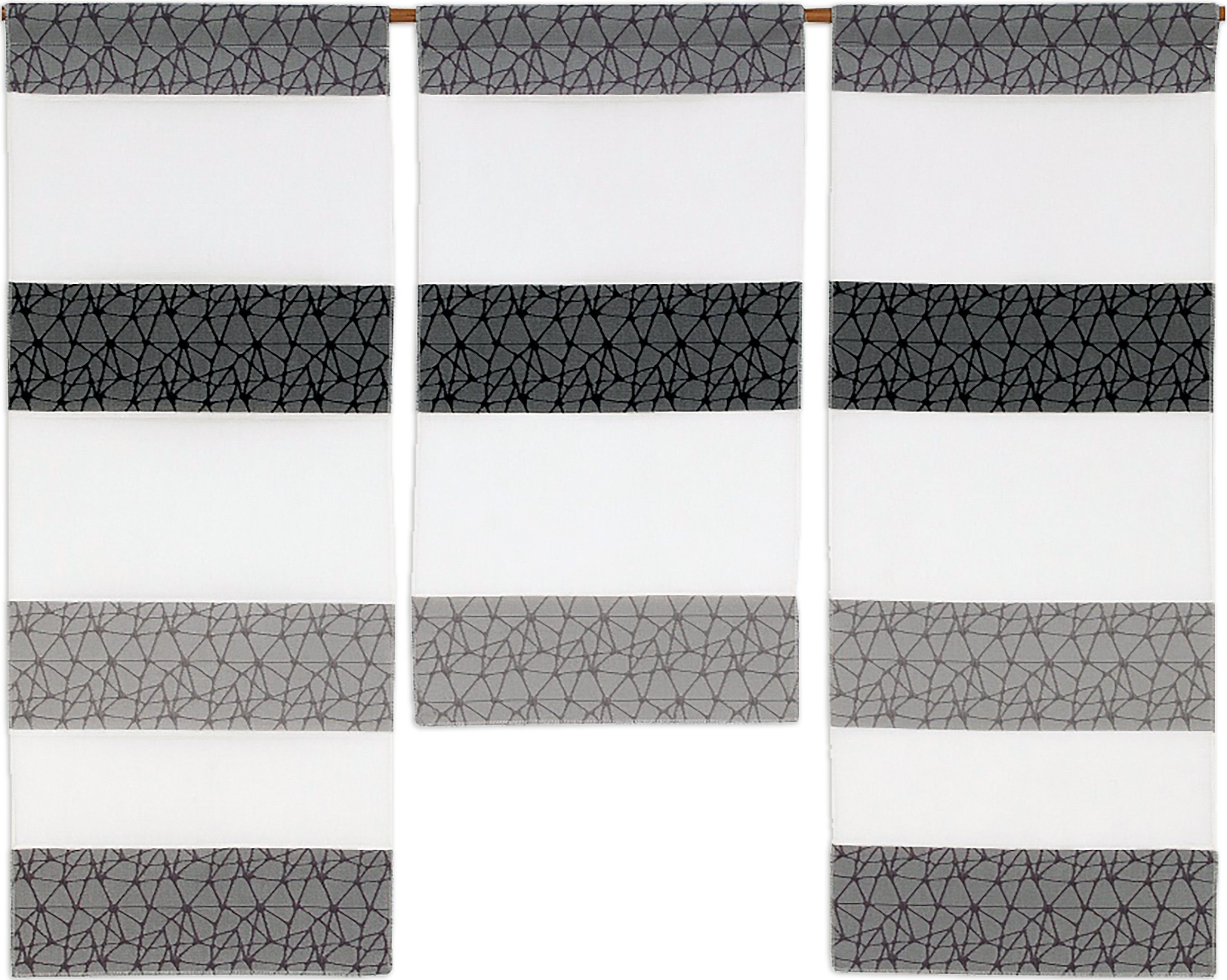 Das Miniflächen-Set, quer gestreift, ist als Scheibengardine ein absoluter Hingucker für jedes Fenster. Dieses Scheibengardinen Set besteht aus 3 kleinen Flächengardinen mit Stangendurchzug oben. Unten befindet sich ein kleiner Saum für eine Beschwerungs- bzw. Abstandsstange. Die 3 Flächengardinen auf eine Scheibengardinenstange schieben und gleichmäßig auf die Scheibe verteilen, direkt aneinander, oder auch mit einer kleinen Lücke zwischen den einzelnen Elementen, geben die Miniflächen eine moderne Dekoration ab. Die Miniflächen sind fertig genäht und leicht zu montieren, entweder auf eine Stilgarnitur Durchmesser 12mm oder auf eine einfache ausziehbare Scheibengardinenstange. Gerne dekoriert im Kinderzimmer, Küche, Büro, aber auch im Wohnzimmer oder Esszimmer. So einfach kann man eine günstige Gardine selbst dekorieren.