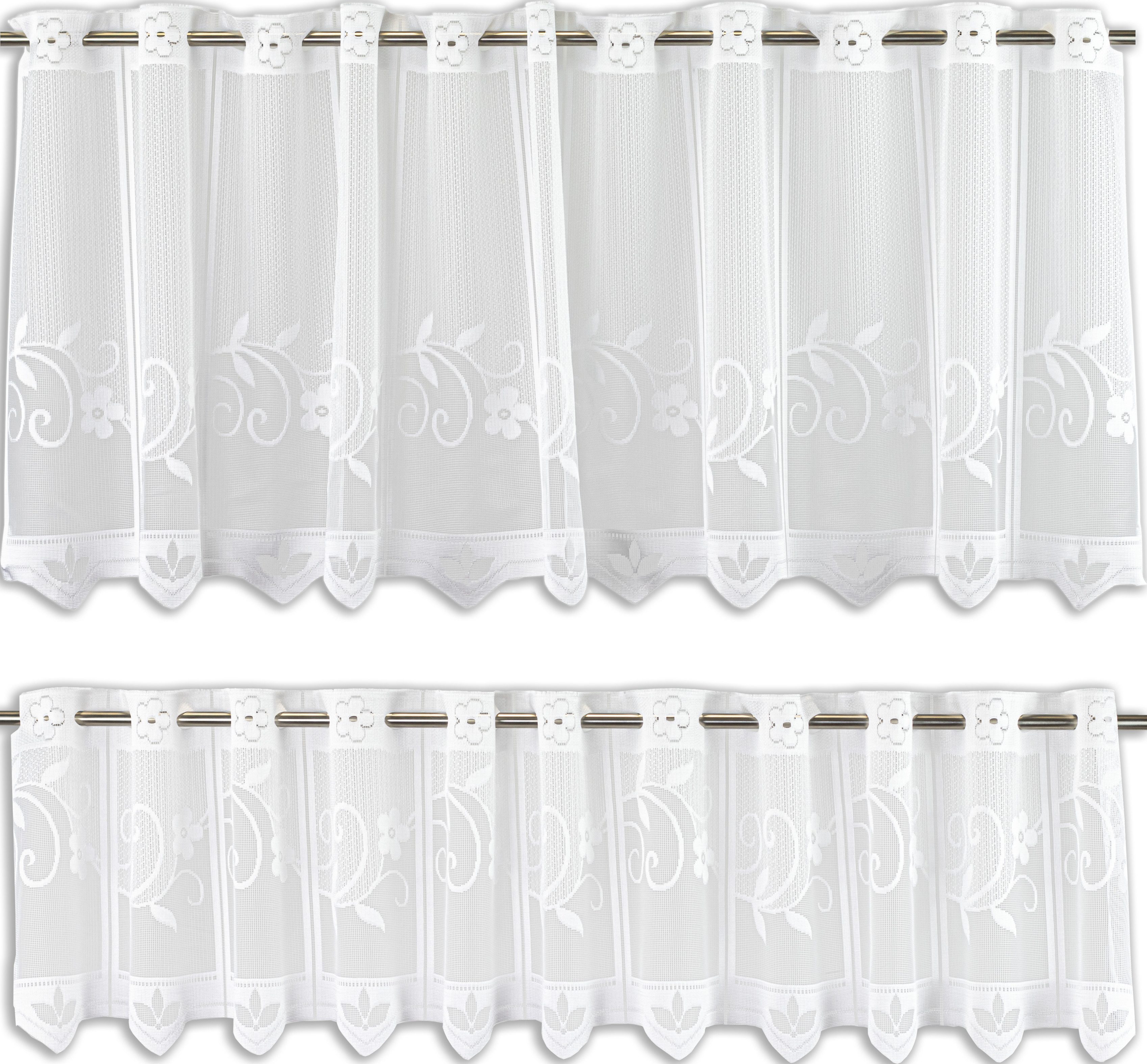 Weißes Bistrogardinen Set mit einem modernen Rankenmuster. DIe Küchengardine ist aus Wirkware und Weiß, halbtransparent.