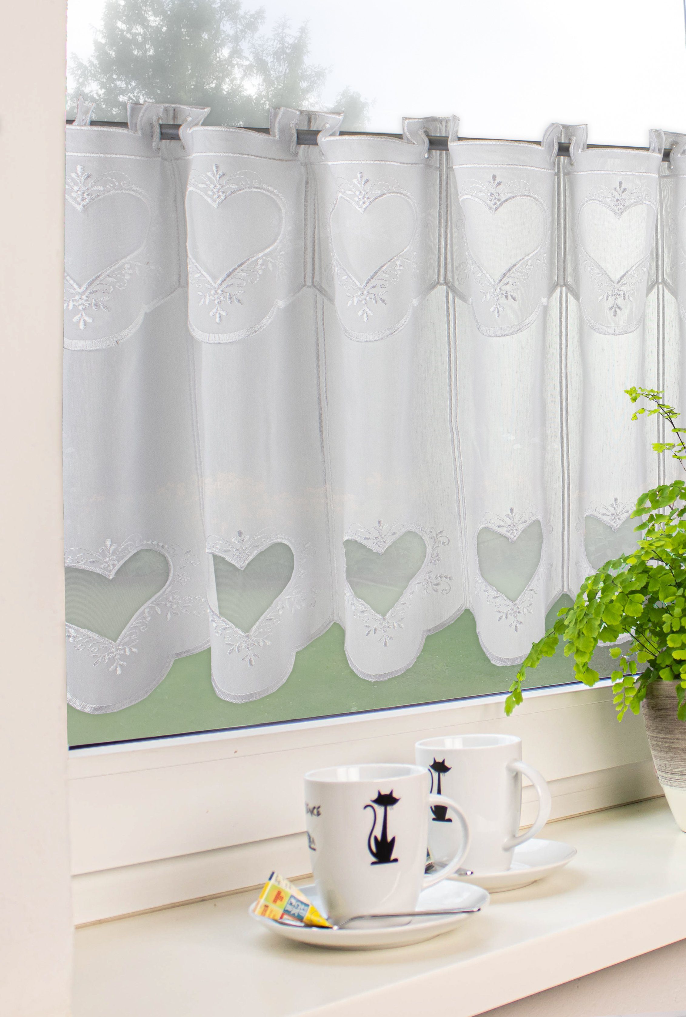 Hochwertige weiße Scheibengardine aus halbtransparentem weißen Batist mit Applikationsstickereien.
