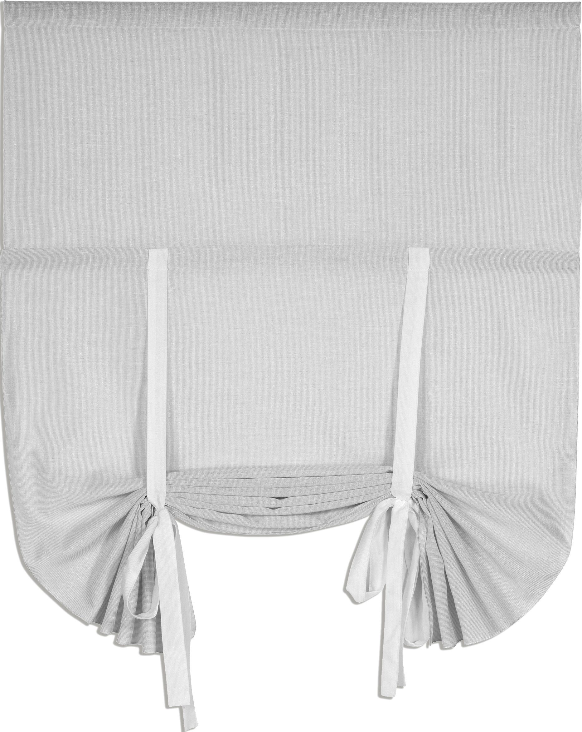 Das Raffrollo ist in den Farben Grau mit wollweißen Bändern und Wollweiß mit grauen Bindebändern erhältlich.