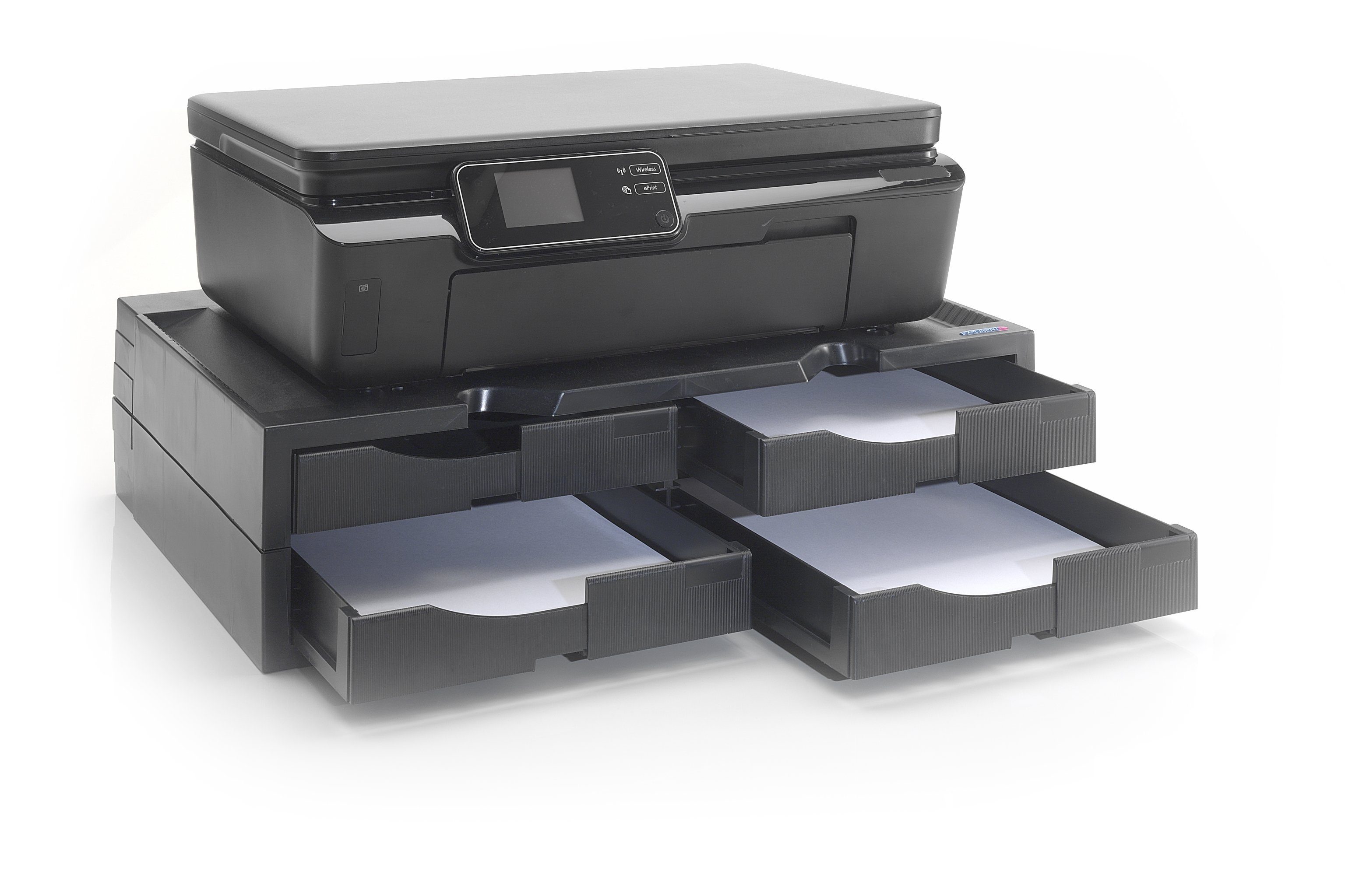 Hochwertiger Druckerständer für Tintenstrahldrucker, schwere Laser-Drucker oder Multifunktionsgeräte bis zu 40 kg. Mit vier herausziehbaren Schubladen für die Ablage von kompletten DIN A4 Packungen à 500 Blatt, Briefumschlägen, Etiketten oder Ersatzkartuschen. Es können auch zwei Druckerständer übereinandergestapelt werden für eine noch größere Ablagekapazität von verschiedenen Papieren.