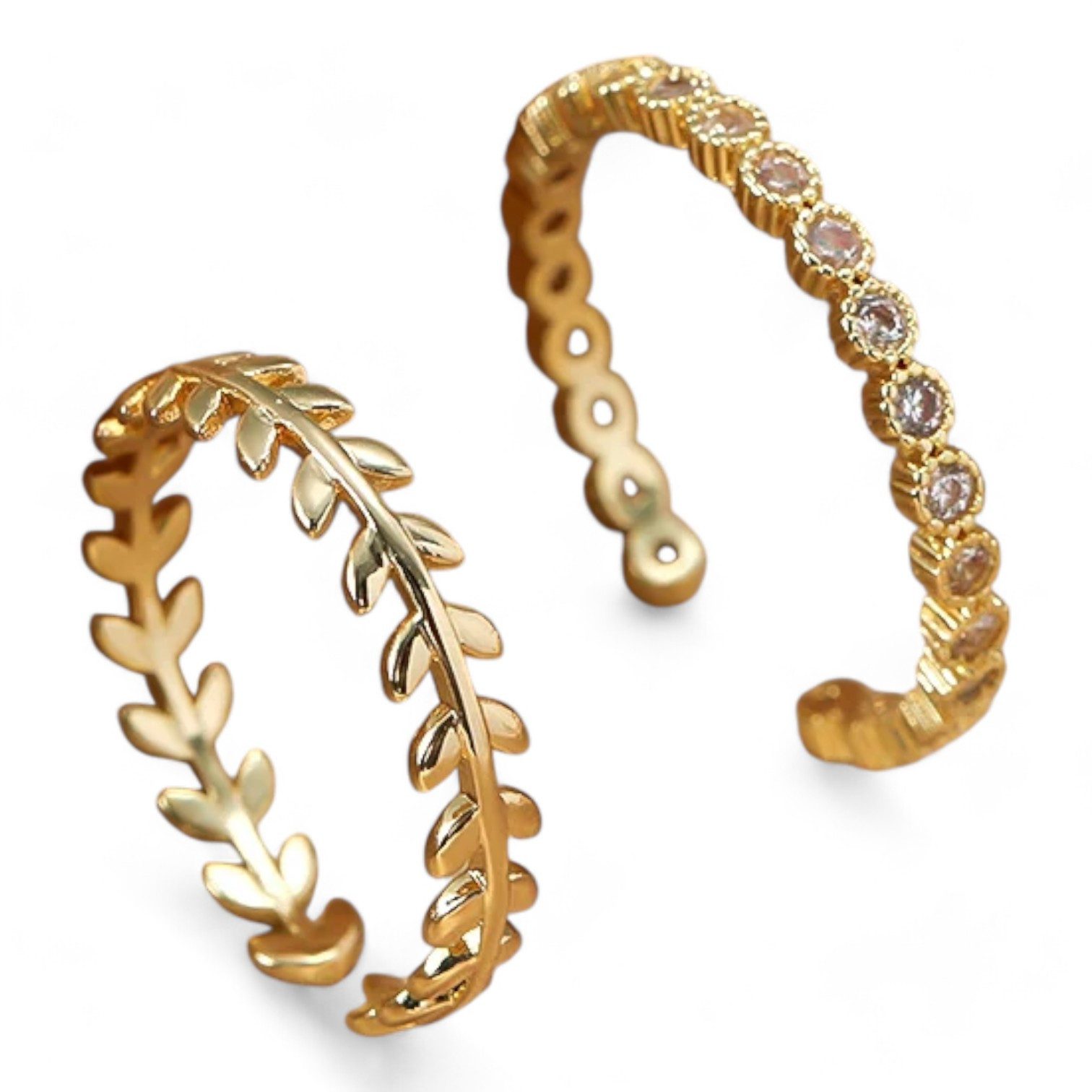 Größenverstellbares offenes Ringset. Bestehend aus 1 Ring Lorbeerkranz und 1 Ring runde Zirkonia Edelsteine
