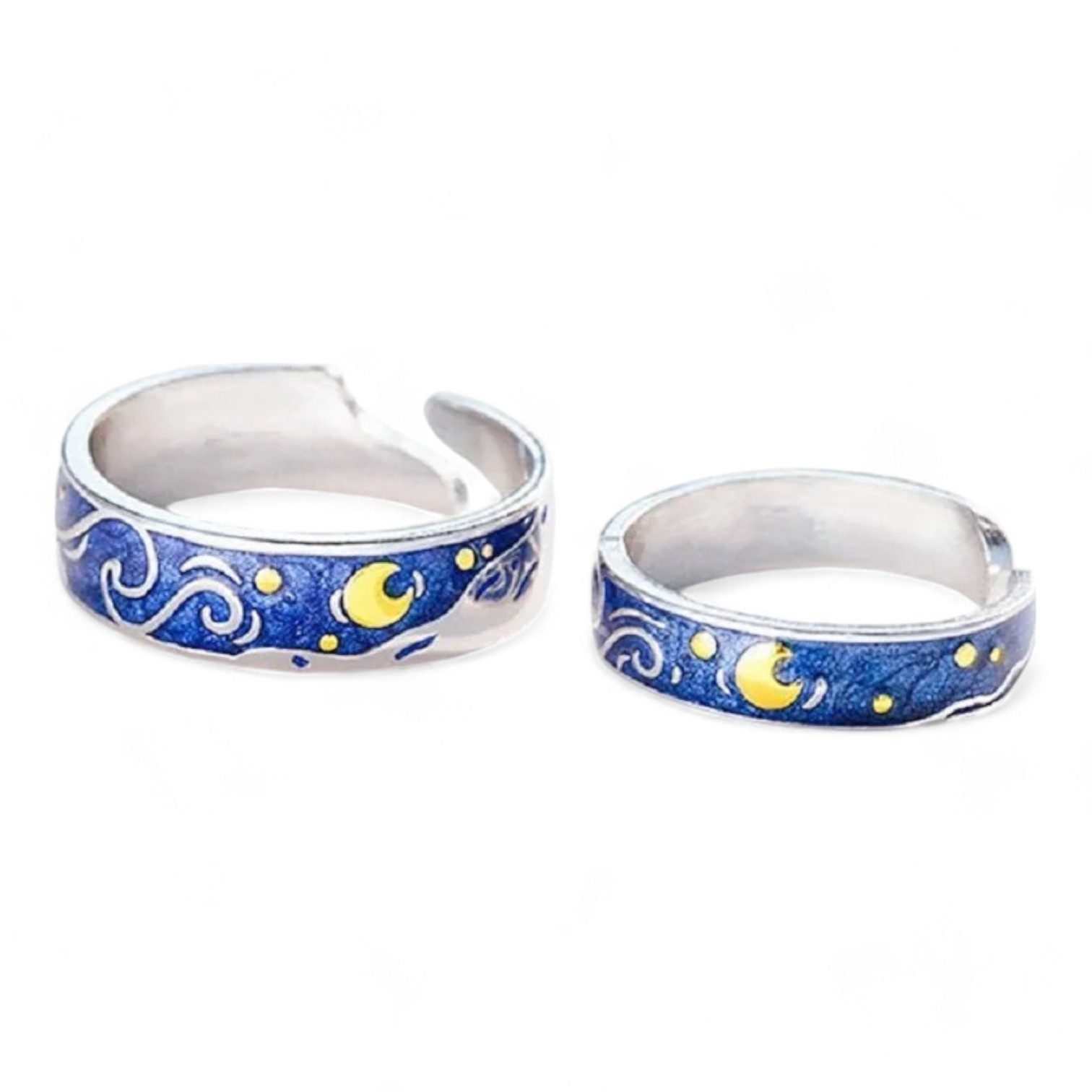 2er Ringset mit den Wellen und Mond. Blau, Gelb und Silber.