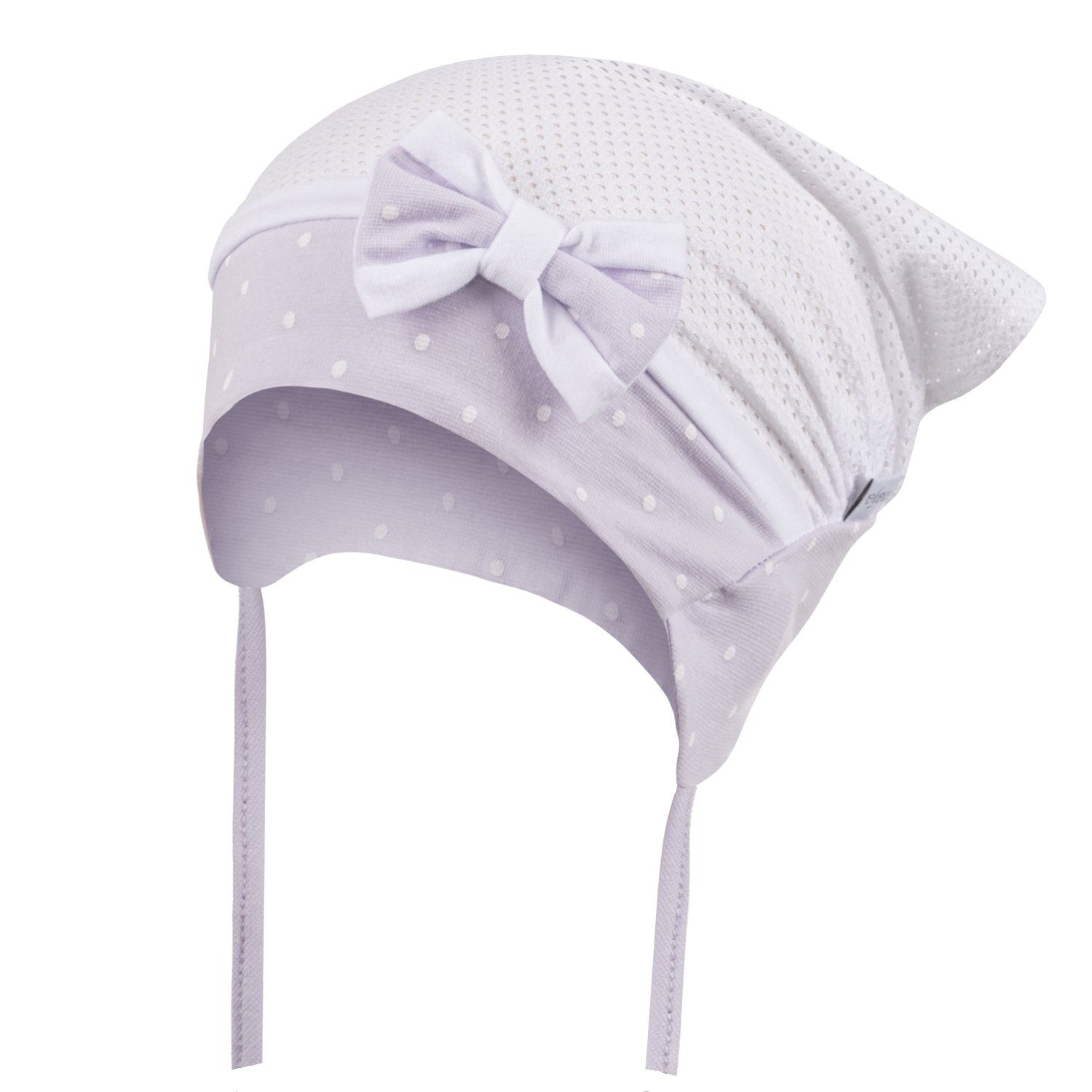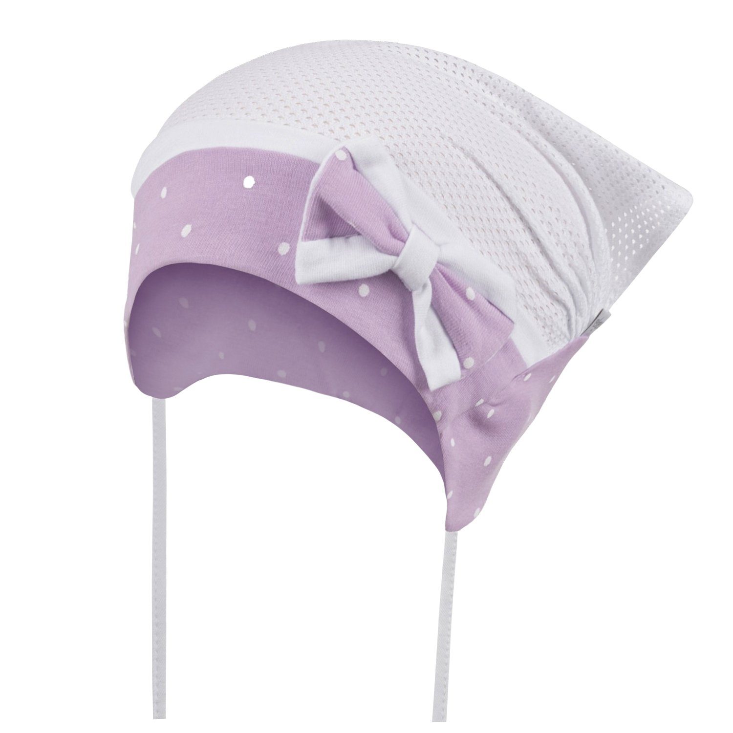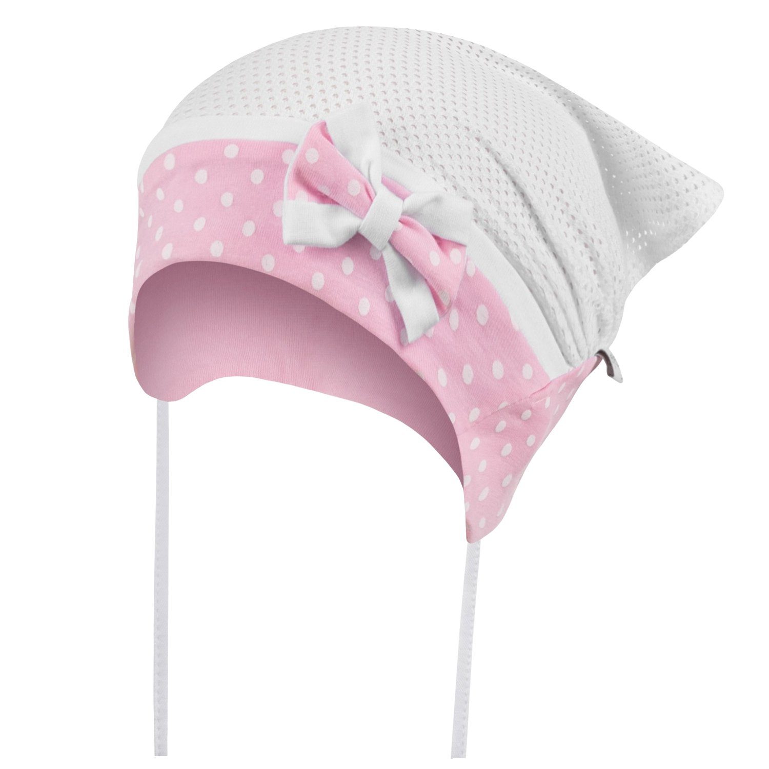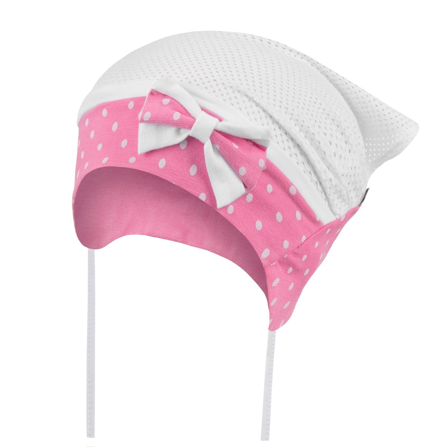 Süßes Kopftuch für kleine Baby-Mädchen. Das Kopftuch ist hinten offen und mit einem Gummiband versehen. Die zwei Bindebändern sorgen für einen sicheren Halt. Die seitlichen Verlängerungen dienen zusätzlich als Ohrenschutz/Windschutz. Die Sommermütze ist teilweise gepunktet, die große Schleife rundet das Design ab. Durch den oberen Netzstoff ist die Mädchenmütze ein luftiger Begleiter für warme Frühlings- und Sommertage und ein schönes Accessoire für Ihr Kind.