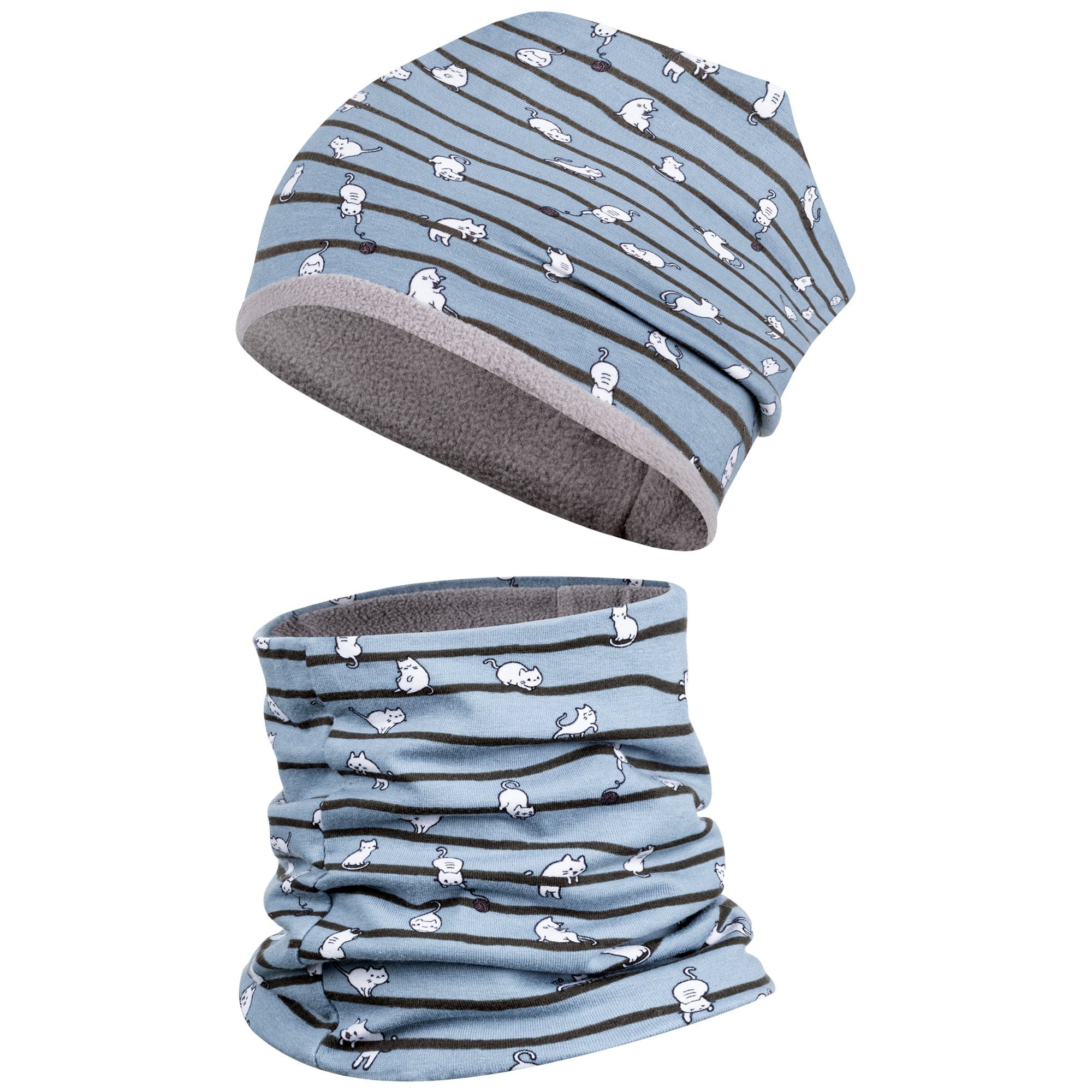 Bequeme Wintermütze und Schal im Set in tollen Designs für Babys und Kleinkinder. Die Wintermütze in beliebter Beanie-Form sowie der Schal sind mit Fleece gefüttert,