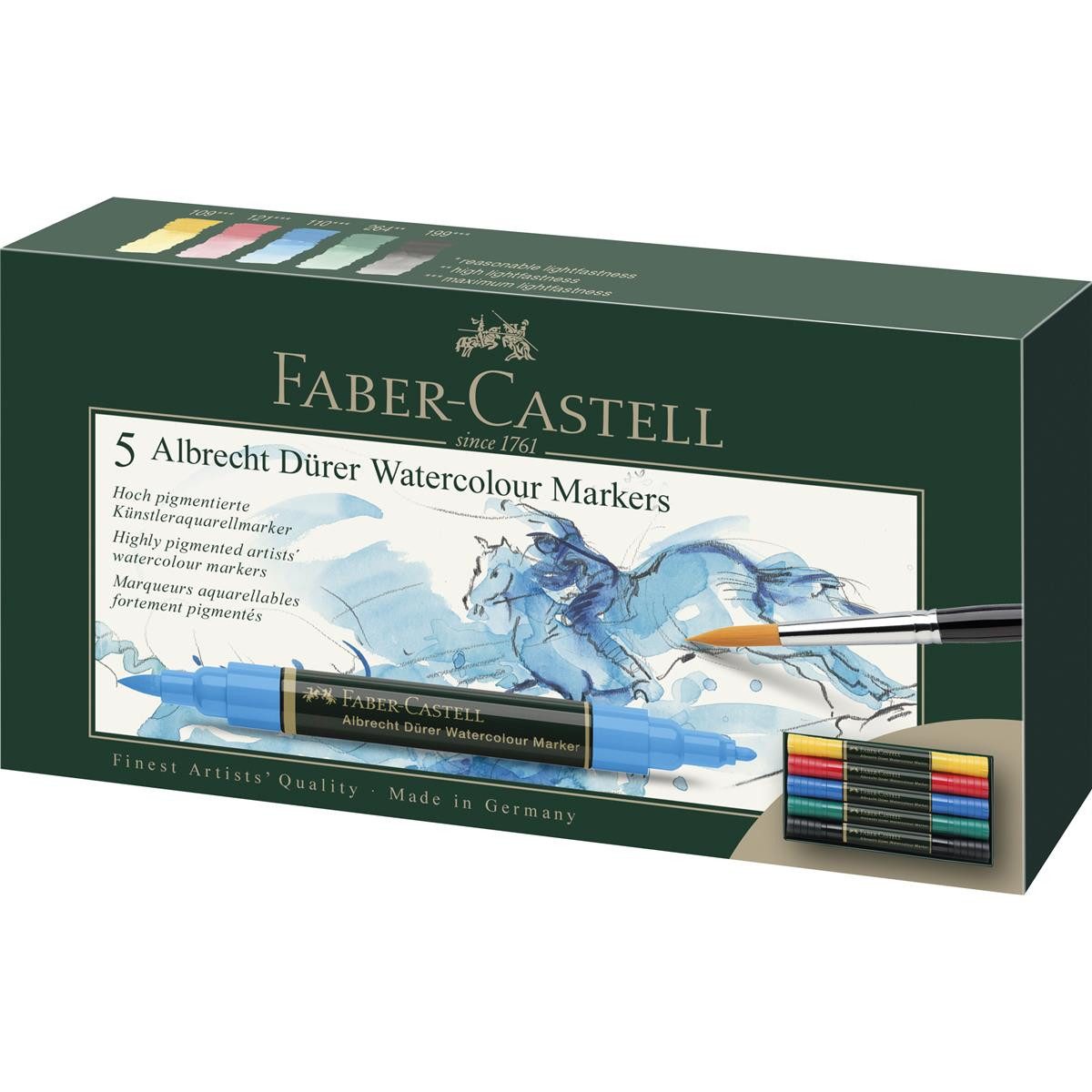 Die Faber-Castell Albrecht Dürer Aquarellmarker im 5er Etui bieten dir die perfekte Kombination aus Kreativität und Präzision. Dieses Set enthält fünf hochpigmentierte Stifte, die ideal zum Malen und Zeichnen geeignet sind. Die besondere Doppelspitze ermöglicht es dir, sowohl dynamische Skizzen mit der weichen Pinselspitze als auch präzise Konturen und Detailzeichnungen mit der stabilen Faserspitze zu erstellen. Mit diesen Aquarellmarkern erlebst du grandiose Wasserfarben-Effekte, die auf Aquarellpapier wunderbar zur Geltung kommen.