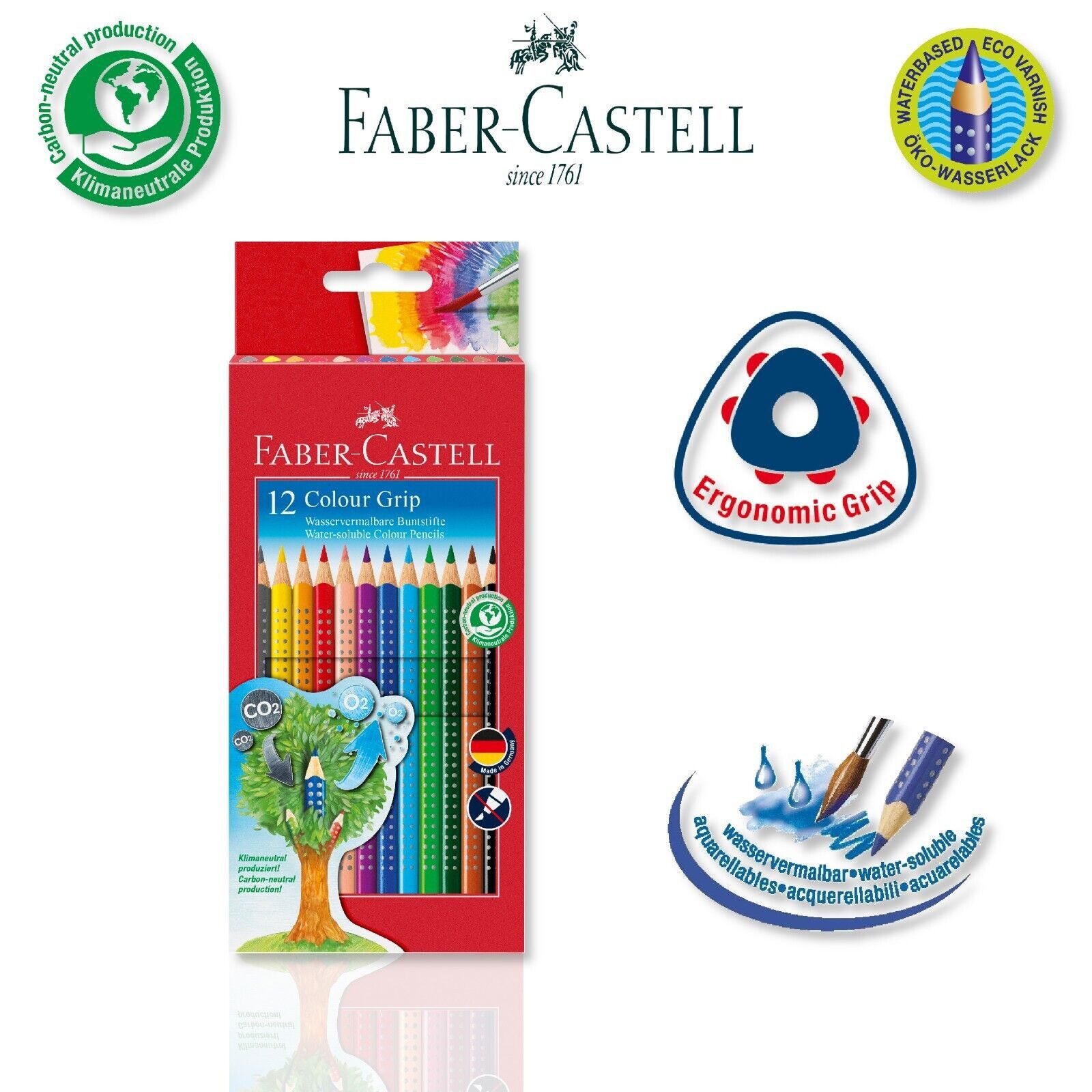 Faber-Castell 112412 - Farbstifte Colour Grip 12 Stück im Kartonetui Ein Etui für Kindergartenkinder und Schulanfänger mit 6, 12 oder 24 Faber Castell GRIP Farbstiften. Von vielen Pädagogen empfohlen, denn die ergonomische Dreikantform und die patentierte Soft-GRIP-Zone sorgen für entspanntes und lockeres Malen und Schreiben. Die hoch pigmentierten, weichen Farbminen bringen nicht nur die Kinderbilder zum Leuchten, sondern auch die Kinderaugen, wenn sie voller Stolz ihre kleinen Kunstwerke den Eltern zeigen. Besonders schöne Ergebnisse entstehen durch die Wasserlöslichkeit der Pigmente. Einfach Farbe auftragen, mit einem Pinsel drüber malen und sofort entstehen großartige Aquarelleffekte. Der Schaft der Stifte besteht aus Holz, die Lackierung ist auf Wasserbasis und hat die Farbe der jeweiligen Mine. Die Размер des Stiftes ist (Ø x L): 6 x 175 mm, die Mine hat einen Durchmesser von 3 mm. Damit die Stifte nicht vertauscht werden können, ist auf der oberen Hälfte des Stiftes ein Namensfeld integriert, dass leicht beschriftbar ist.