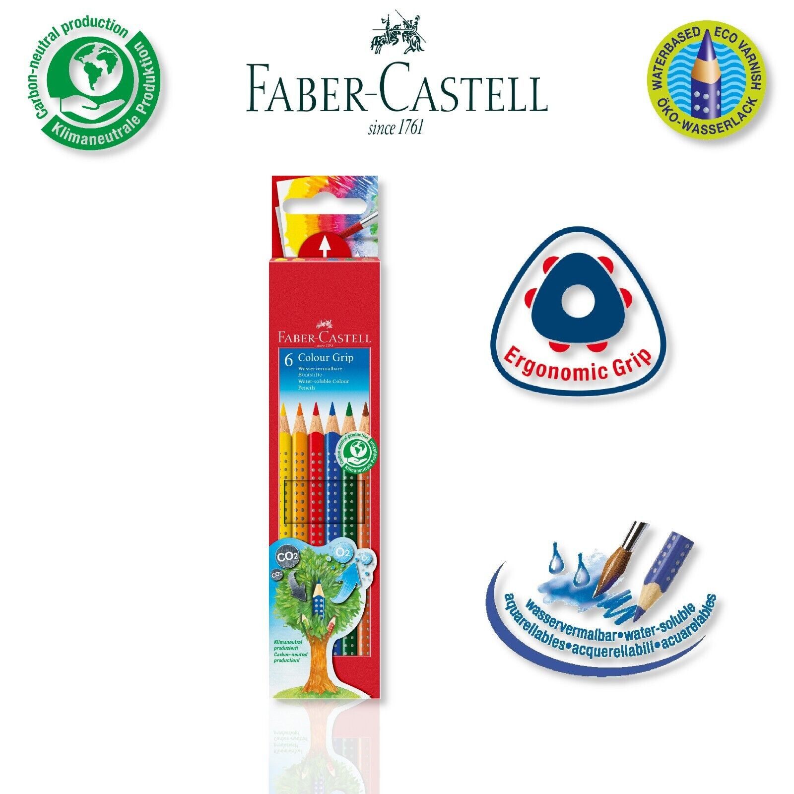Dünnkern Dreikant Farbstifte mit Soft Grip Zone für sicheren Griff, Mine vollständig wasservermalbar, 6er Kartonetui sortiert. Ein Etui für Kindergartenkinder und Schulanfänger mit 6 Faber Castell GRIP Farbstiften. Von vielen Pädagogen empfohlen, denn die ergonomische Dreikantform und die patentierte Soft-GRIP-Zone sorgen für entspanntes und lockeres Malen und Schreiben. Die hoch pigmentierten, weichen Farbminen bringen nicht nur die Kinderbilder zum Leuchten, sondern auch die Kinderaugen, wenn sie voller Stolz ihre kleinen Kunstwerke den Eltern zeigen. Besonders schöne Ergebnisse entstehen durch die Wasserlöslichkeit der Pigmente. Einfach Farbe auftragen, mit einem Pinsel drüber malen und sofort entstehen großartige Aquarelleffekte. Der Schaft der Stifte besteht aus Holz, die Lackierung ist auf Wasserbasis und hat die Farbe der jeweiligen Mine. Die Размер des Stiftes ist (Ø x L): 6 x 175 mm, die Mine hat einen Durchmesser von 3 mm. Damit die Stifte nicht vertauscht werden können, ist auf der oberen Hälfte des Stiftes ein Namensfeld integriert, dass leicht beschriftbar ist.