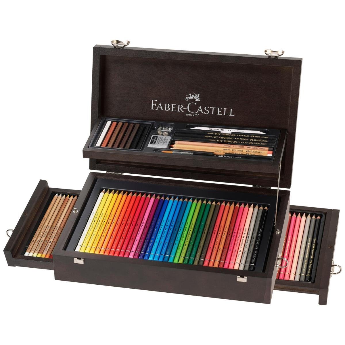 Der Faber-Castell Art & Graphic Compendium - 125er Holzkoffer stellt die ideale Basisausstattung für jeden kreativen Kopf dar. Dieser elegante Holzkoffer in wengefarbenem Design vereint Ästhetik und Funktionalität und ist sowohl als repräsentatives Arbeitsgerät für Künstler als auch als dekoratives Design-Objekt für Ästheten konzipiert. Auf zwei Ebenen präsentiert sich ein umfangreiches Меню, das Polychromos Künstlerfarbstifte, Pastellkreiden und die hochwertigen Albrecht Dürer Aquarellstifte umfasst, ergänzt durch ein kleines Меню Pitt Monochrome Künstlerstifte. Mit dieser umfassenden Auswahl bist du optimal ausgestattet, um deiner Kreativität freien Lauf zu lassen.