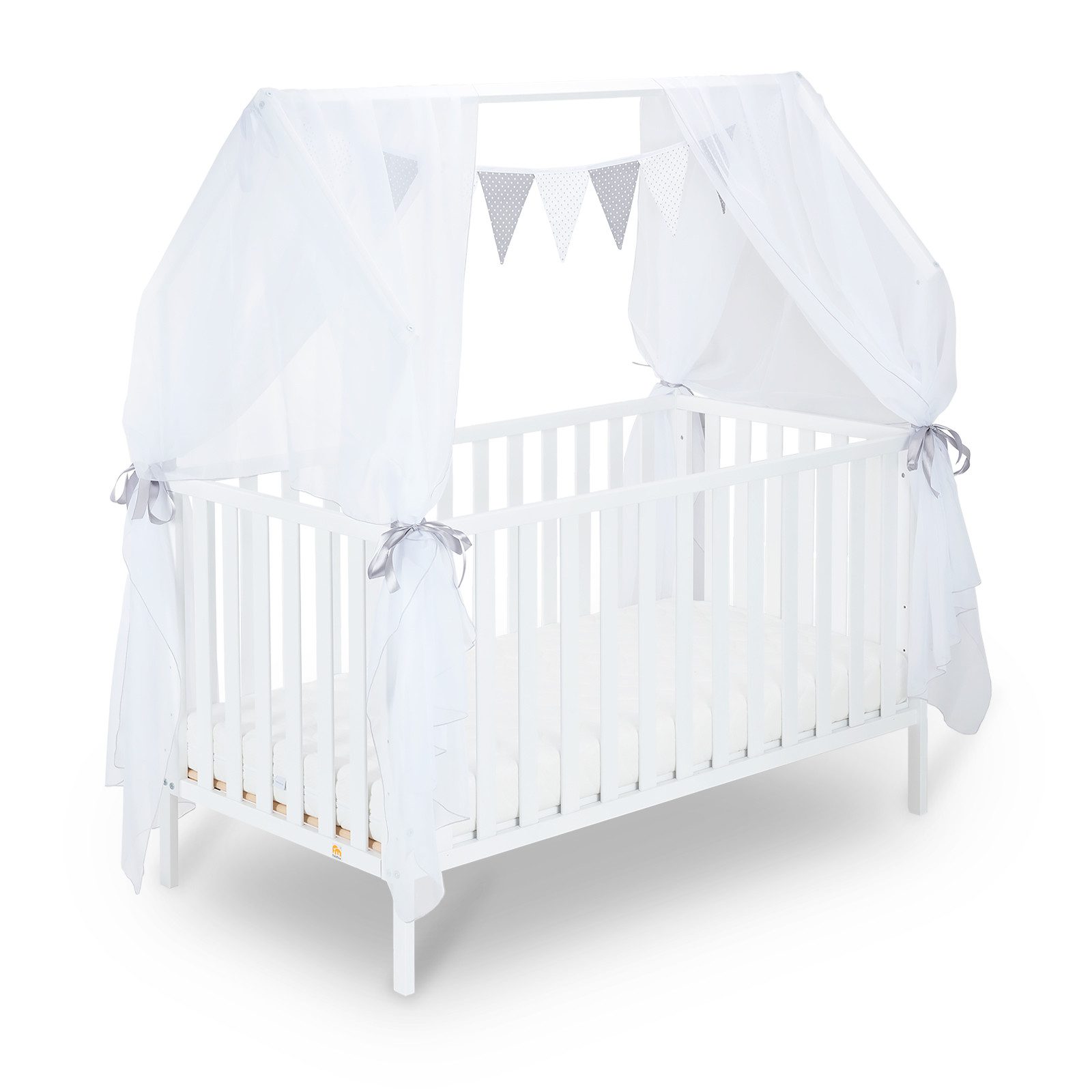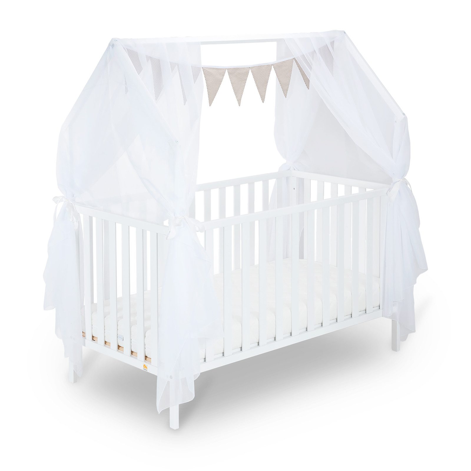 Das Set besteht aus einem zweiteiligen Betthimmel mit dekorativen Bändern und einer farbenfrohen Wimpelkette. Der luftige Himmel mit rahmt das Bett sanft ein und schafft eine geschützte, gemütliche Schlafumgebung. Gleichzeitig sorgt die Wimpelkette für eine spielerische Note – fröhlich, farbig und voller Fantasie.