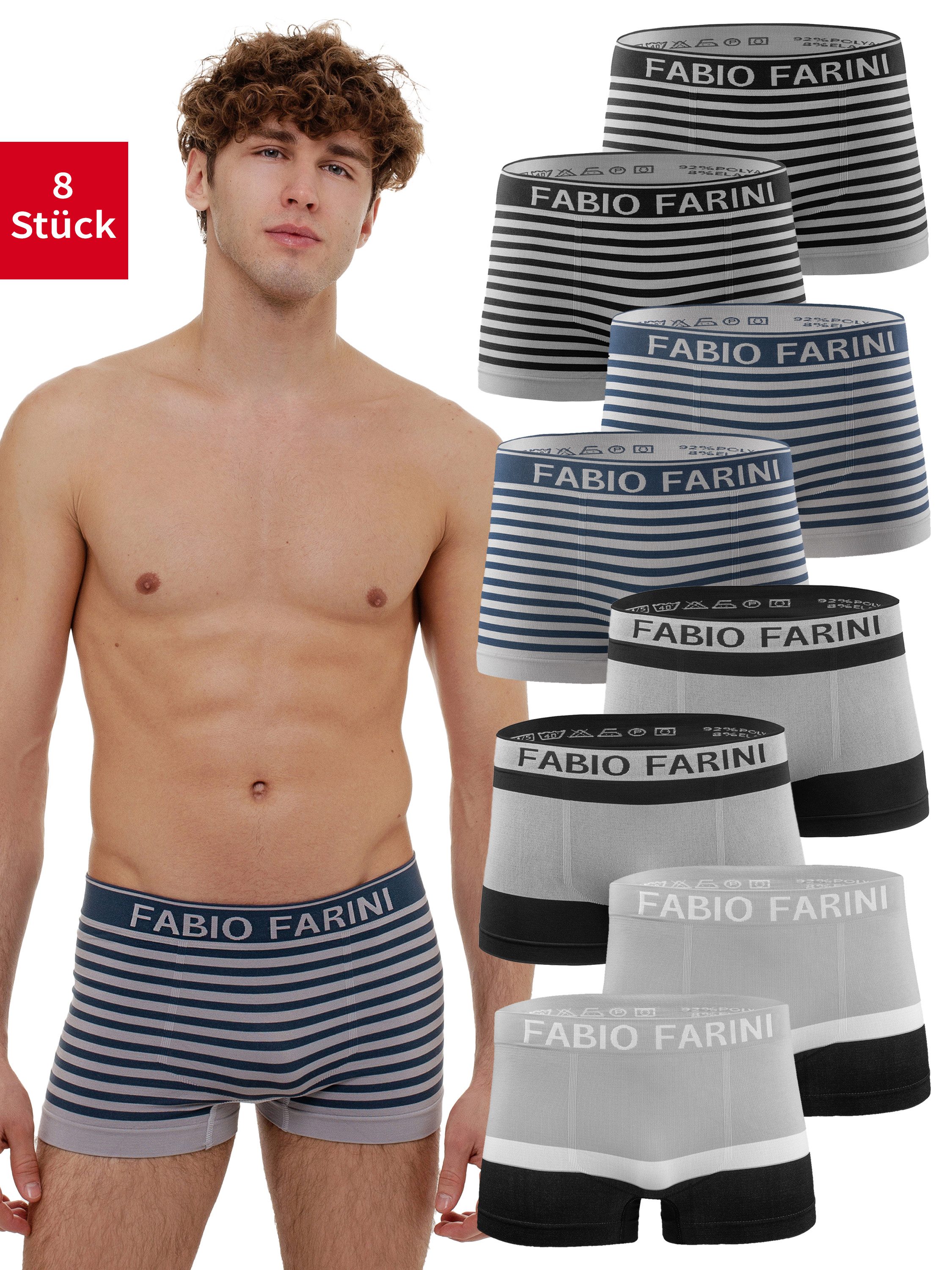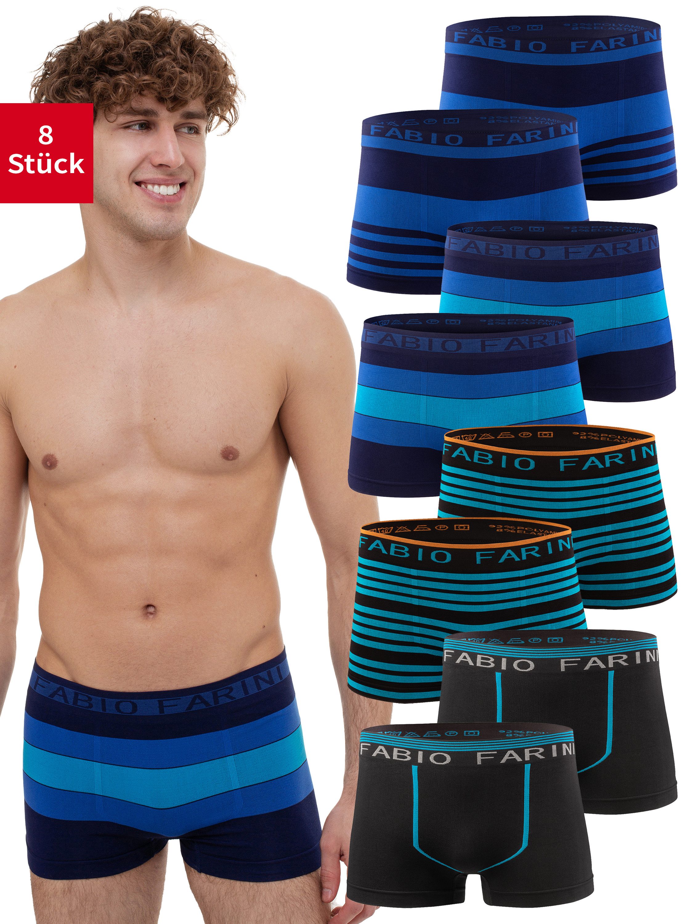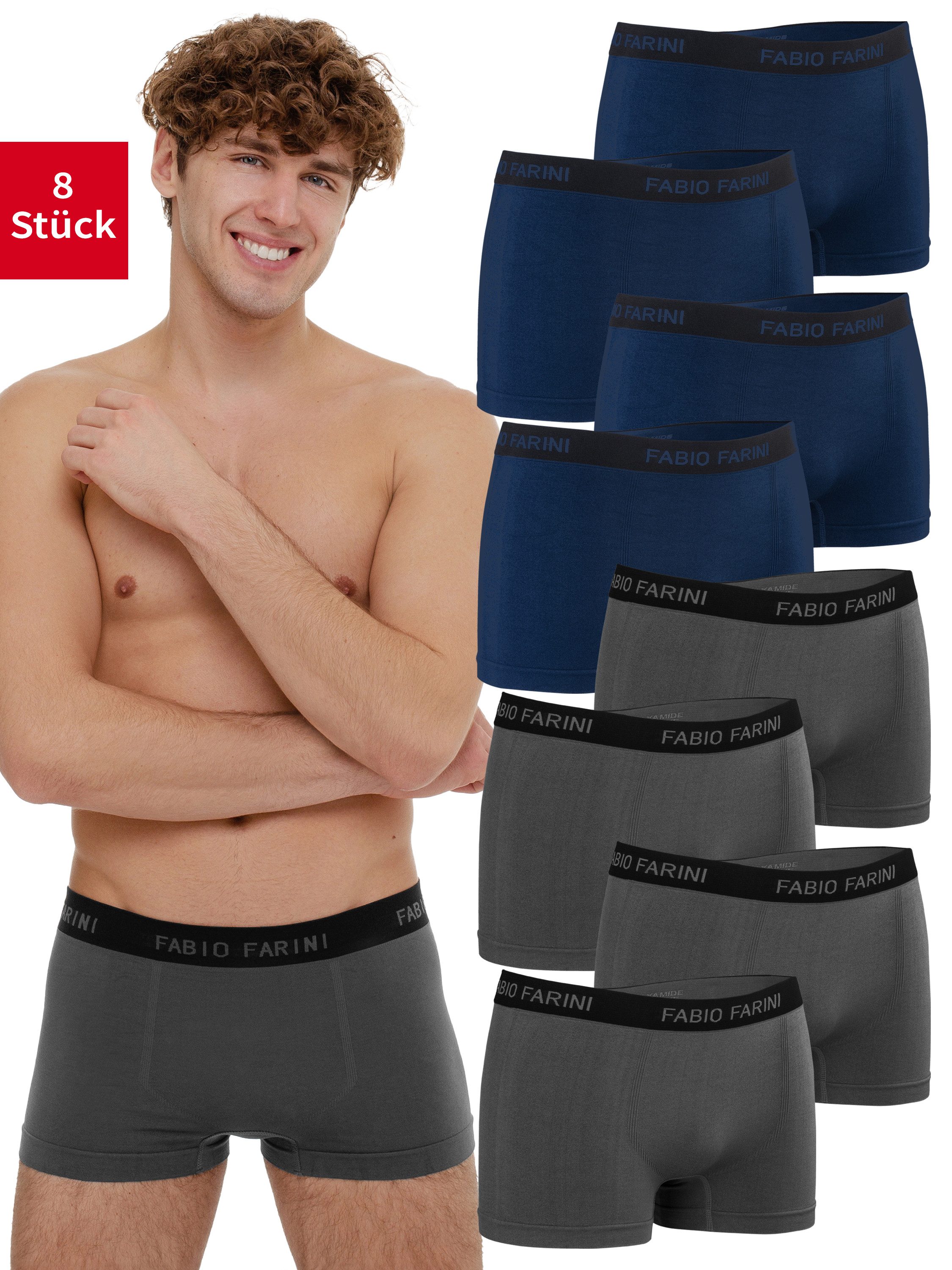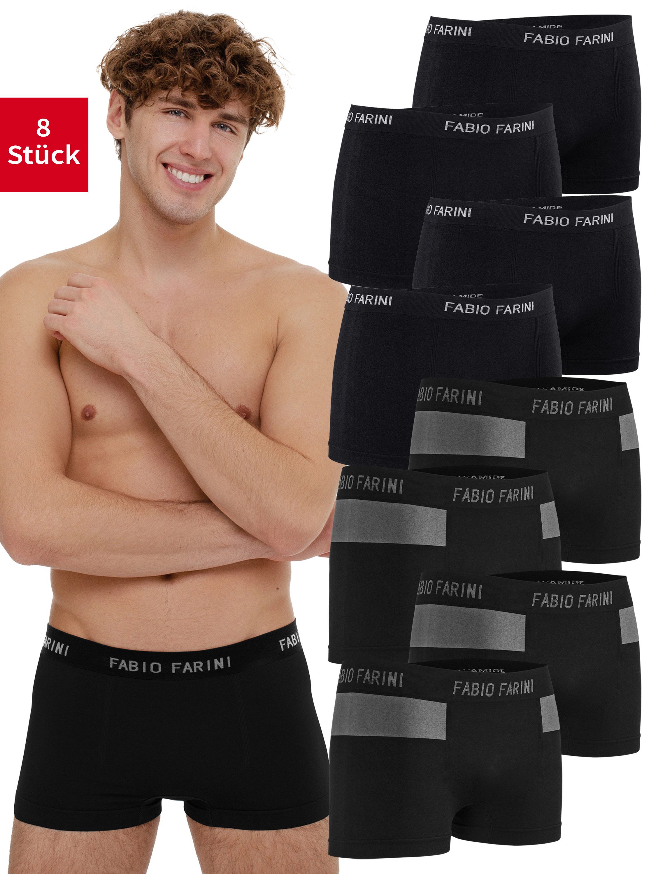Die Boxershorts werden in verschiedenen Achterpacks zu praktischen Bundles kombiniert. Die sportlichen Seamless-Pants aus 92 % Polyamid und 8 % Elastan sind nahtlos gearbeitet, so dass nichts zwickt oder drückt. Die smarten Unterhosen passen sich optimal dem Körper an, sind elastisch und hautsympathisch. Der Bund der Trunks ist dehnbar, hält sie aber sicher auf der Hüfte und trägt wie gewohnt den beliebten Fabio Farini Labelschriftzug.