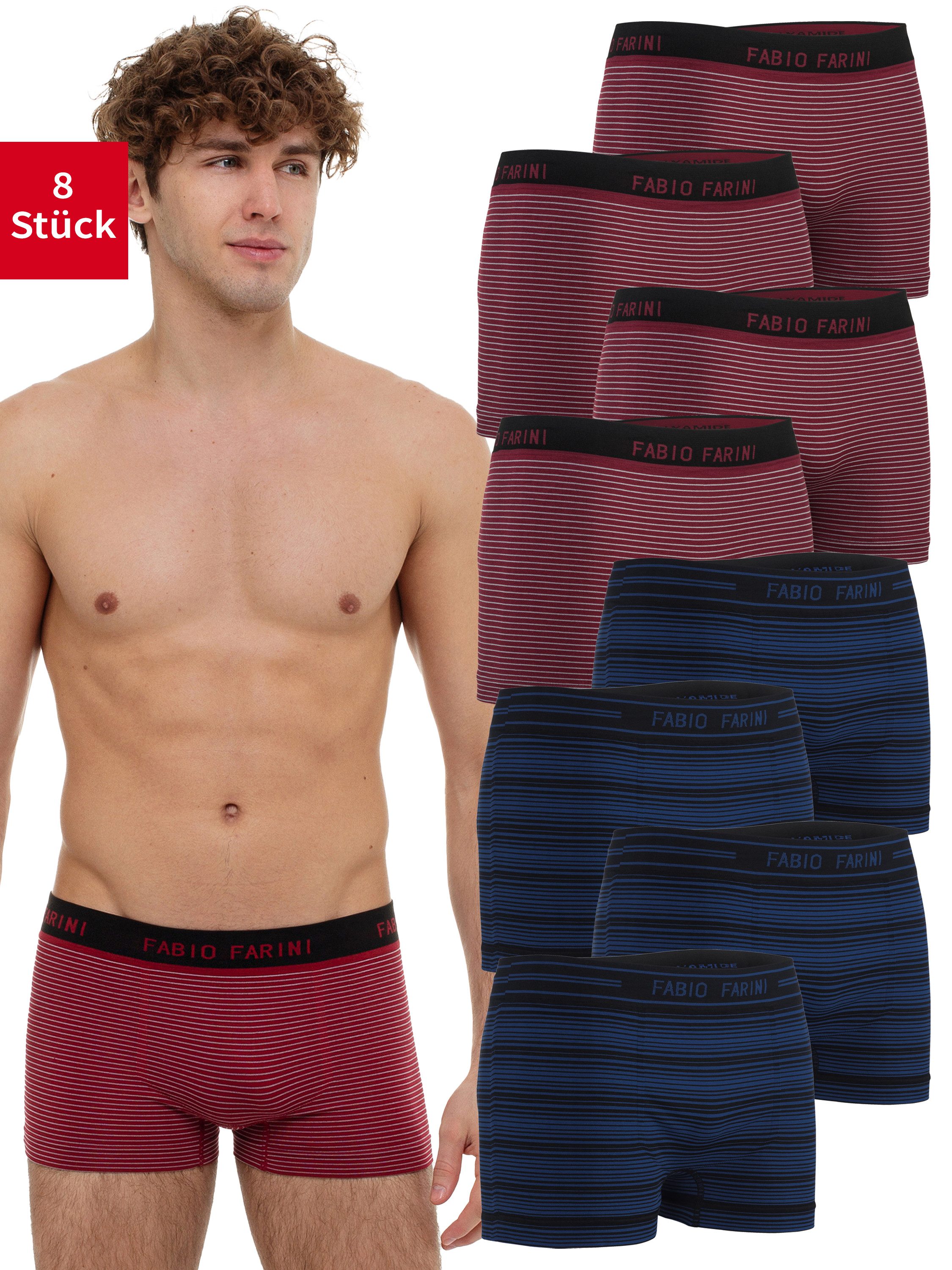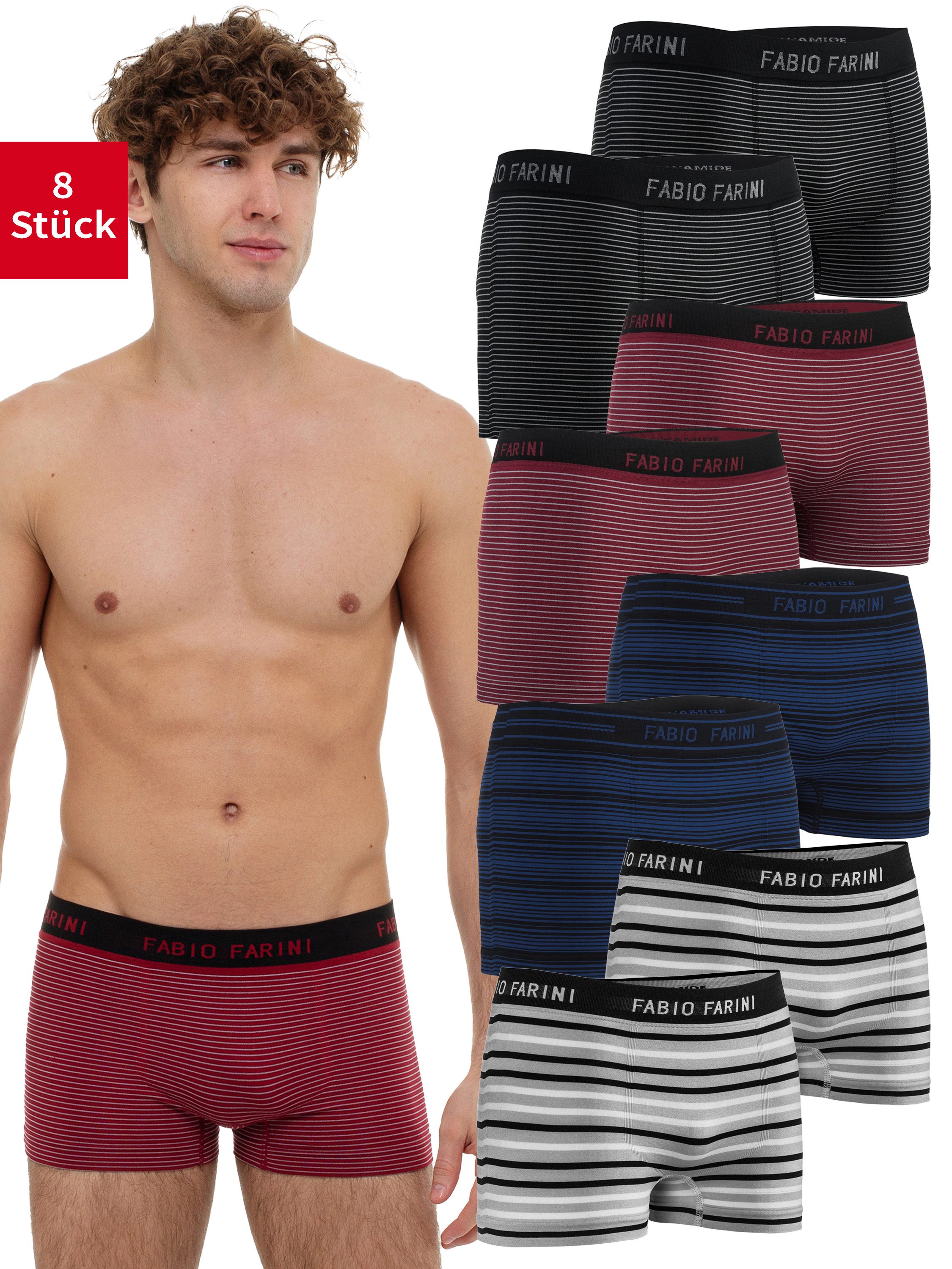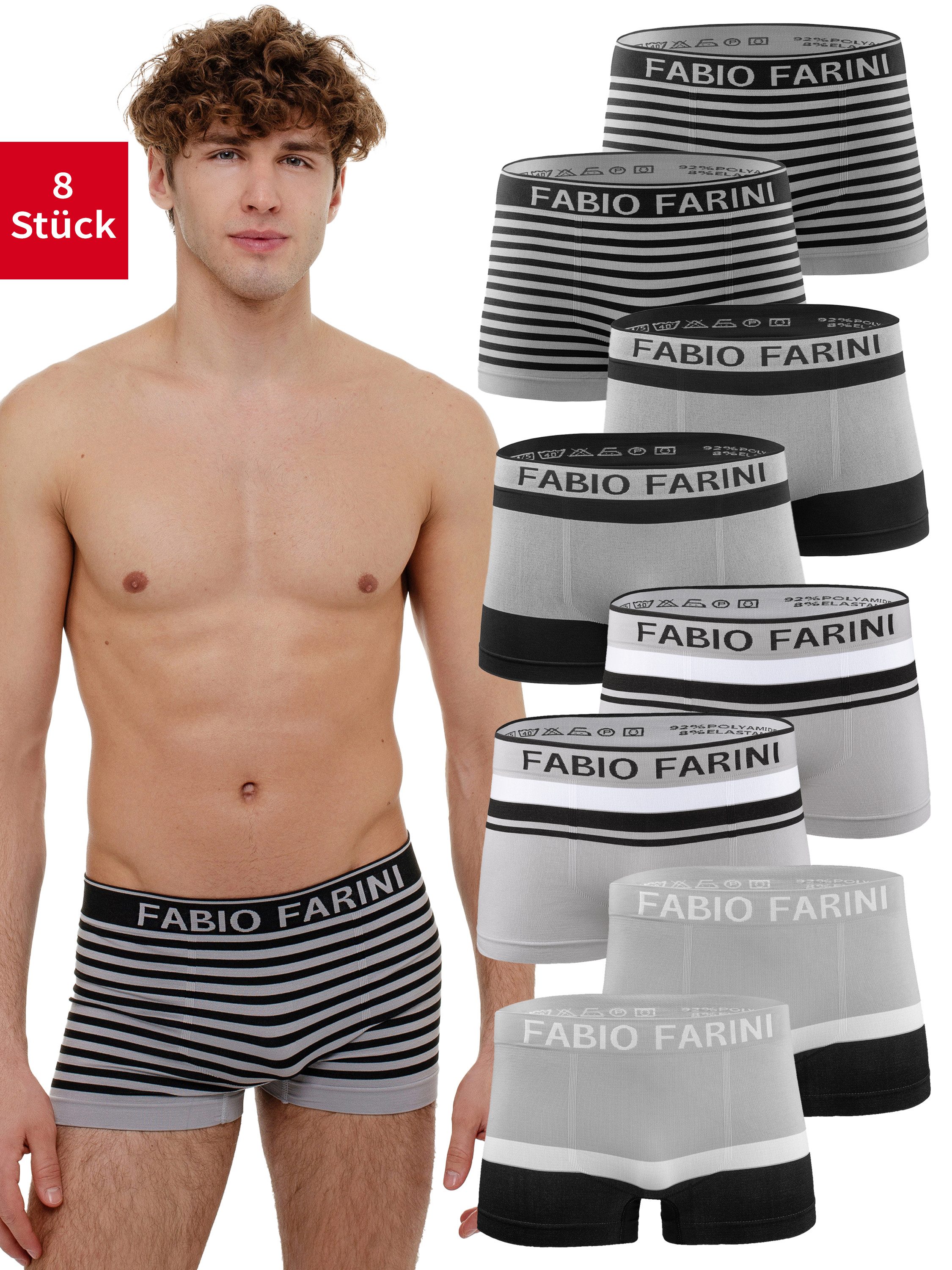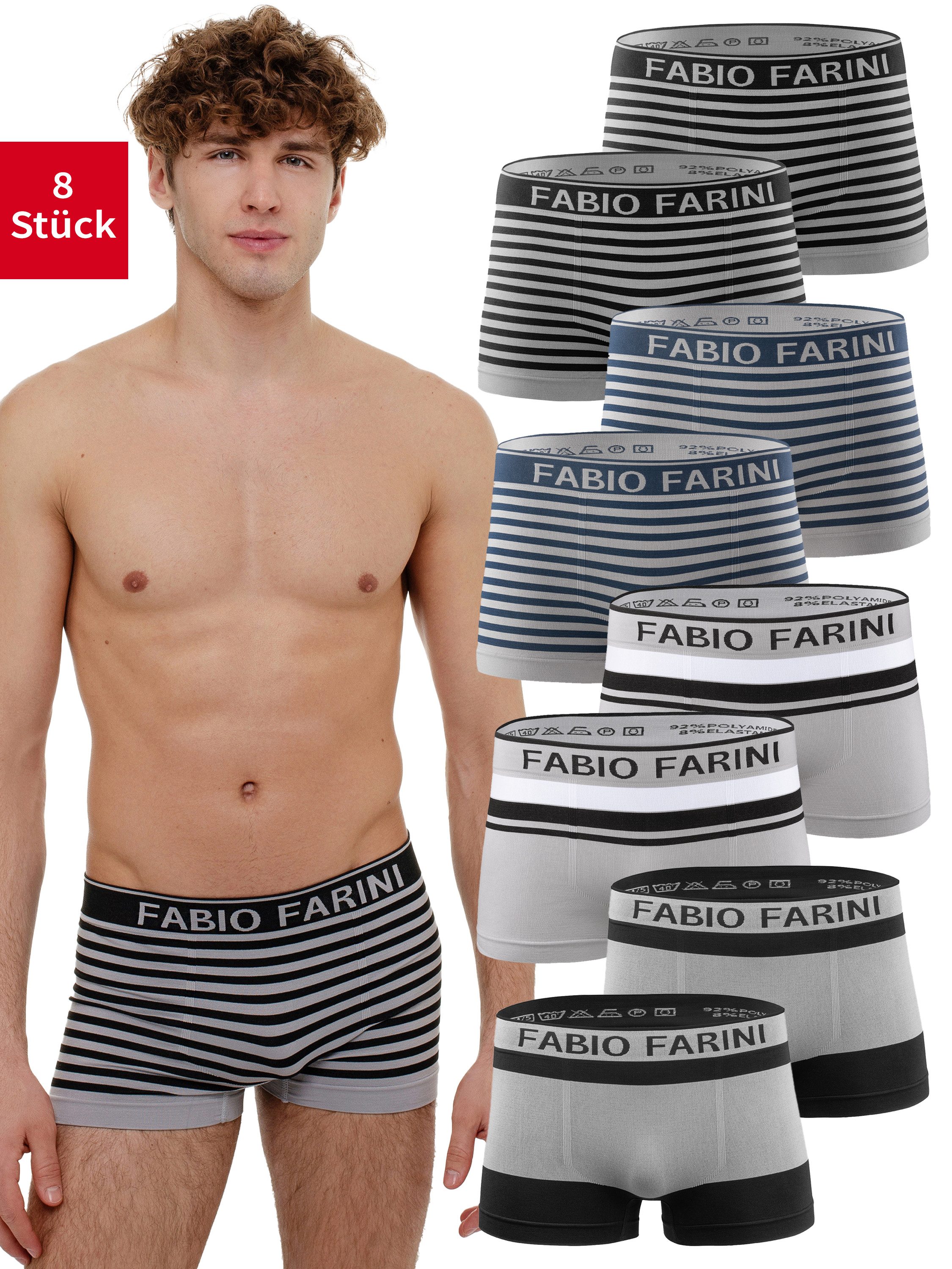 Die Boxershorts werden in verschiedenen Achterpacks zu praktischen Bundles kombiniert. Die sportlichen Seamless-Pants aus 92 % Polyamid und 8 % Elastan sind nahtlos gearbeitet, so dass nichts zwickt oder drückt. Die smarten Unterhosen passen sich optimal dem Körper an, sind elastisch und hautsympathisch. Der Bund der Trunks ist dehnbar, hält sie aber sicher auf der Hüfte und trägt wie gewohnt den beliebten Fabio Farini Labelschriftzug.