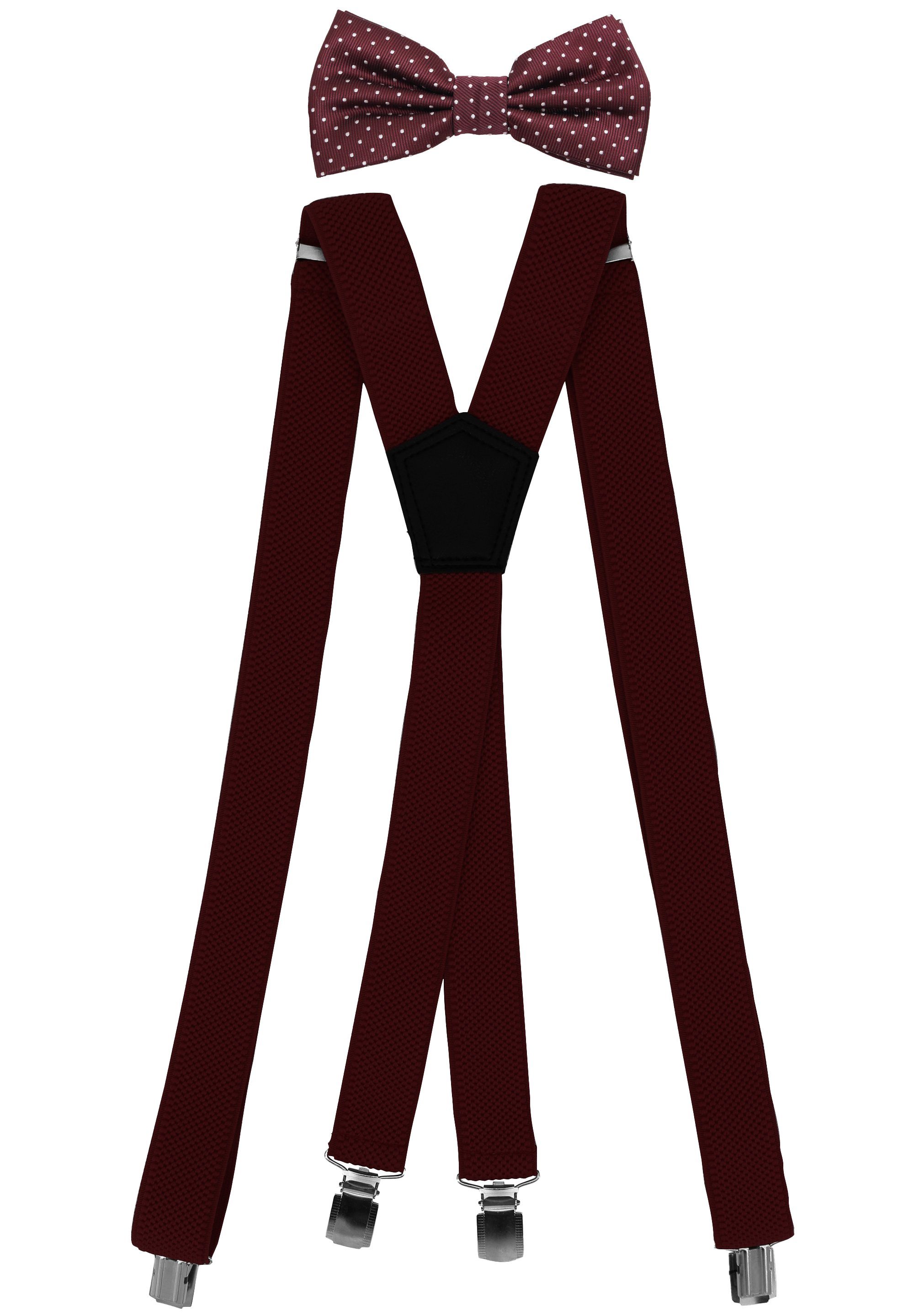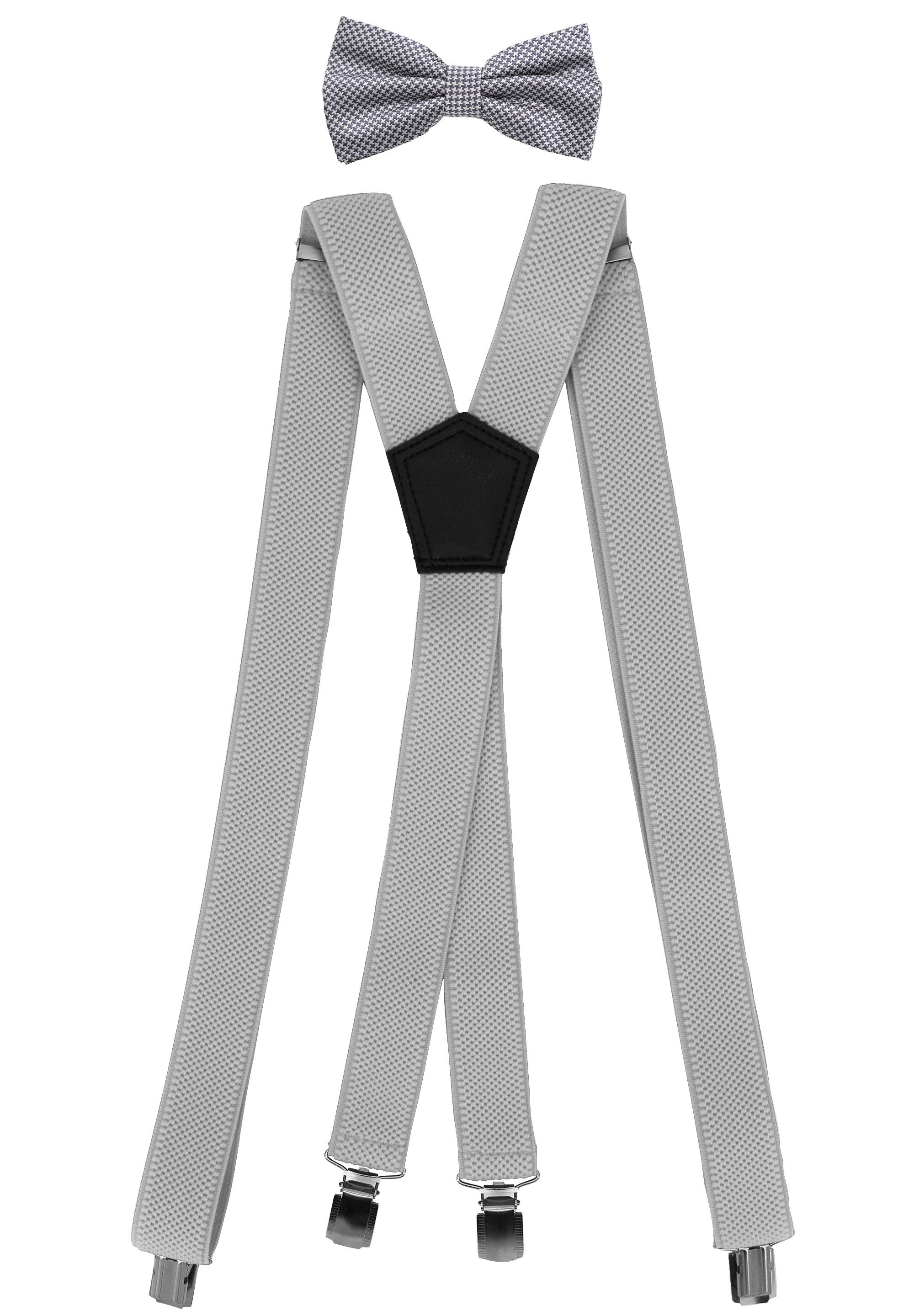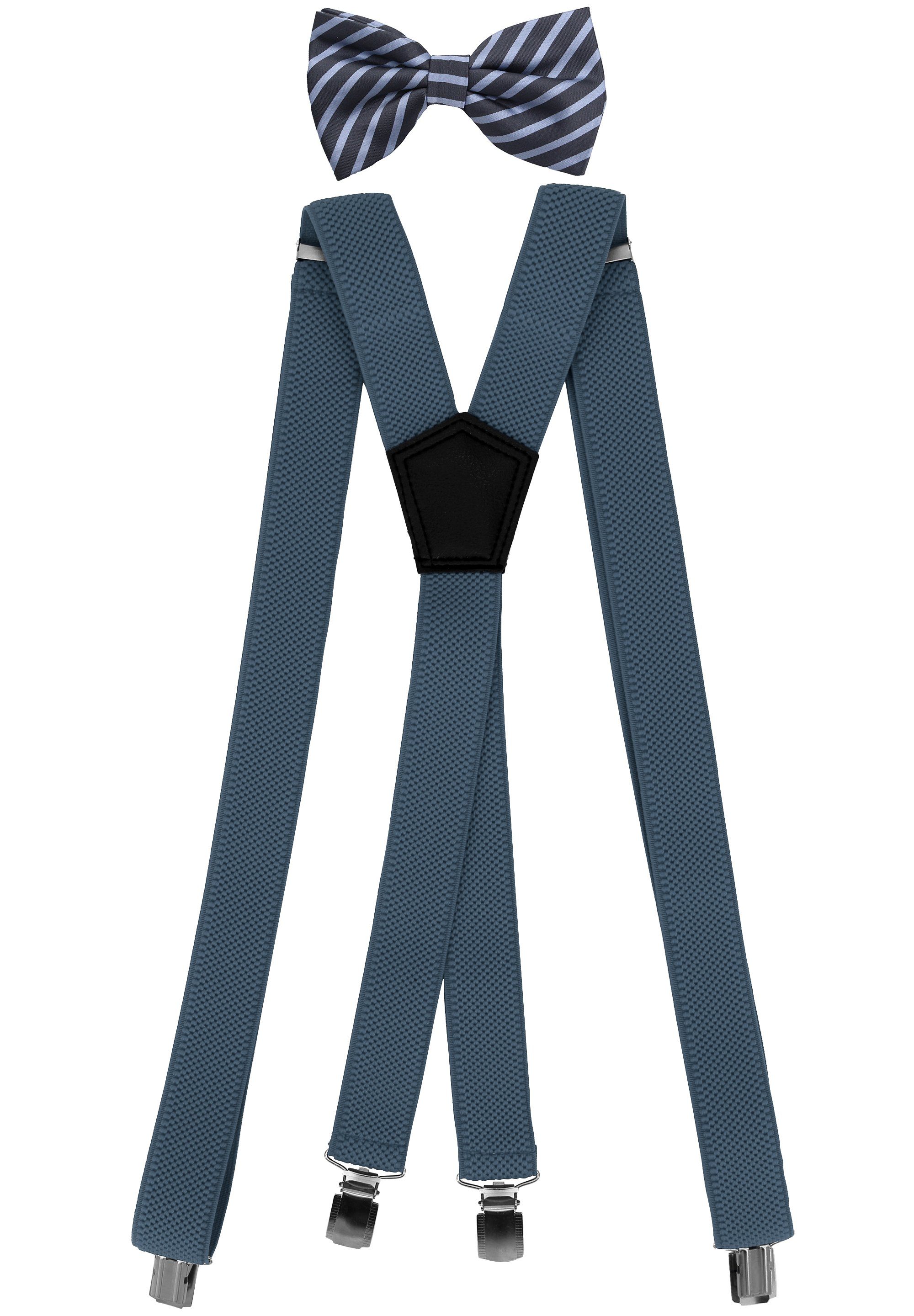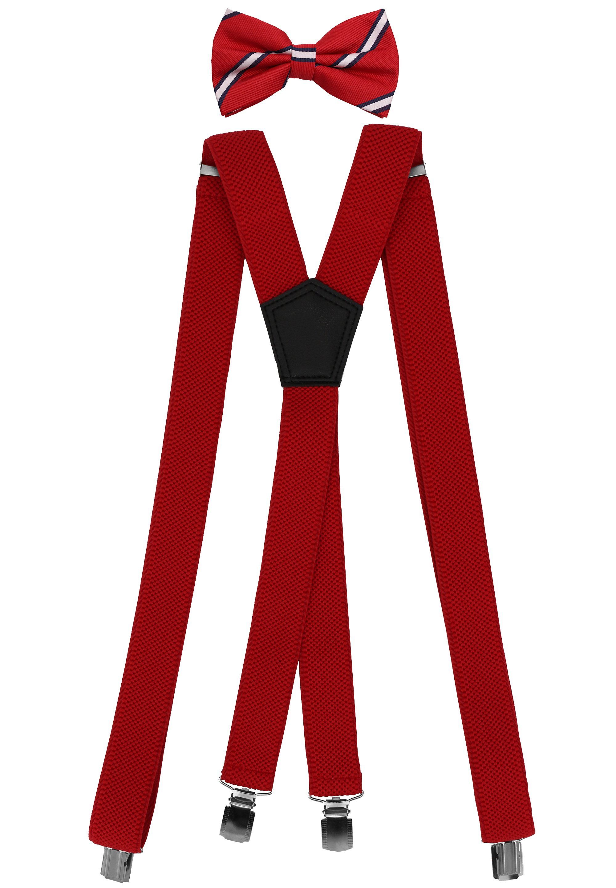 Diese Kombination besteht aus hochwertigen Hosenträgern und einer passenden Fliege. Die Hosenträger sind aus einem angenehmen Material gefertigt, das aus 80% Polyester und 20% Elasthan besteht. Sie haben eine Breite von 3 cm und sind für eine Körpergröße von 120 cm bis 200 cm geeignet. Die extra starken Clips sorgen dafür, dass die Hosenträger sicher an der Hose befestigt bleiben.