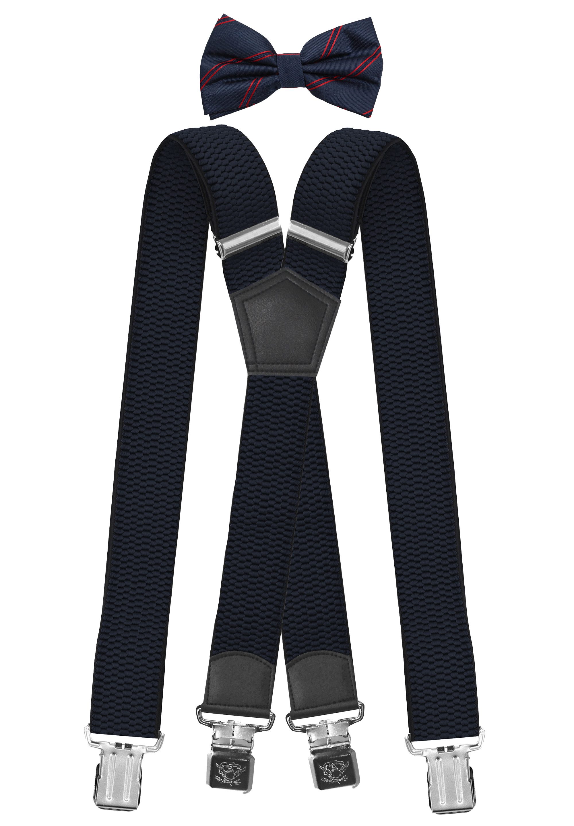 Besondere Merkmale | Set Dunkelblau 4cm Hosenträger - Dunkelblau/Rot Gestreifte Fliege |