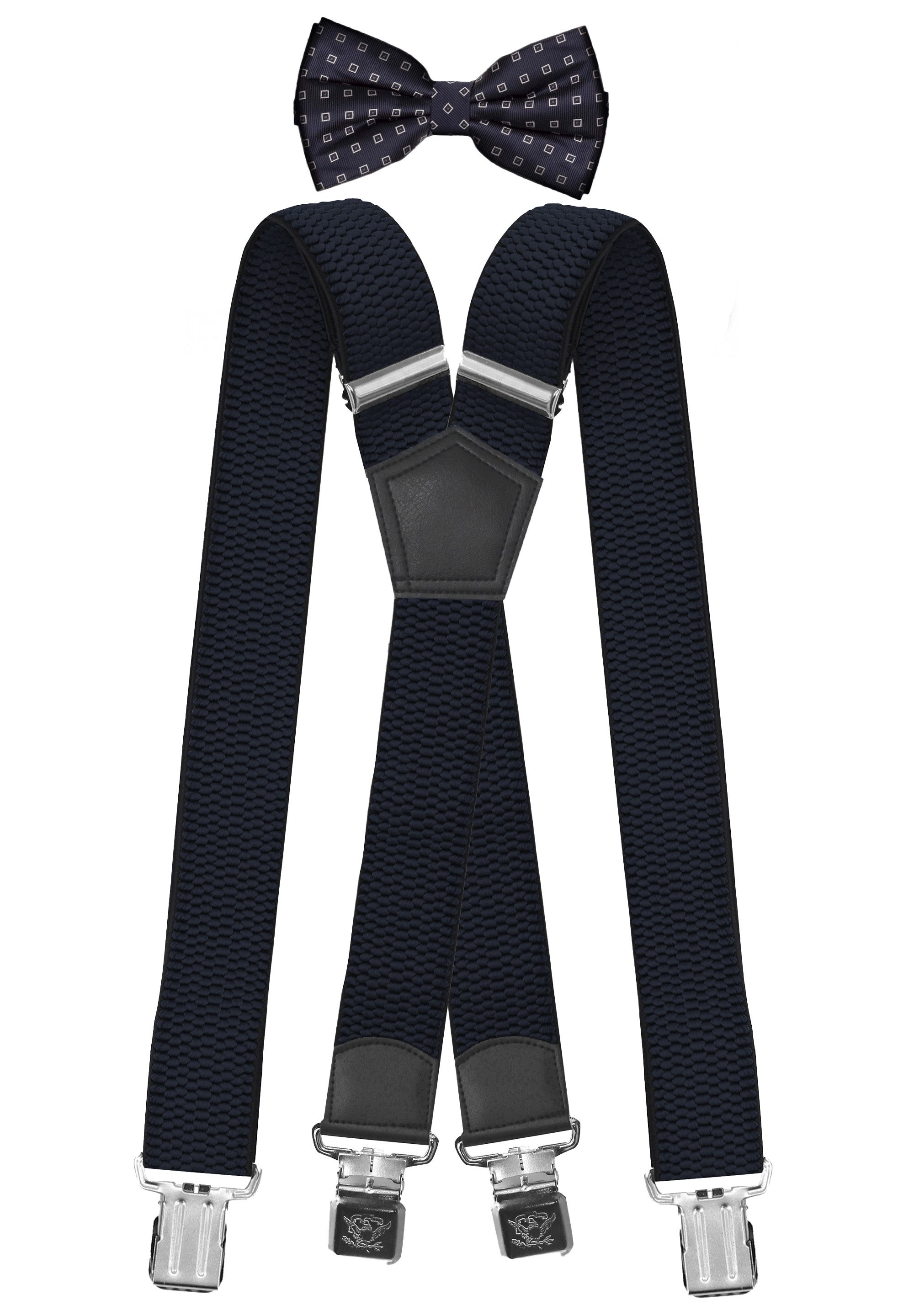 Diese Kombination besteht aus hochwertigen Hosenträgern und einer passenden Fliege. Die Hosenträger sind aus einem angenehmen Material gefertigt, das aus 80% Polyester und 20% Elasthan besteht. Sie haben eine Breite von 4 cm und sind für eine Körpergröße von 120 cm bis 200 cm geeignet. Die extra starken Clips sorgen dafür, dass die Hosenträger sicher an der Hose befestigt bleiben.