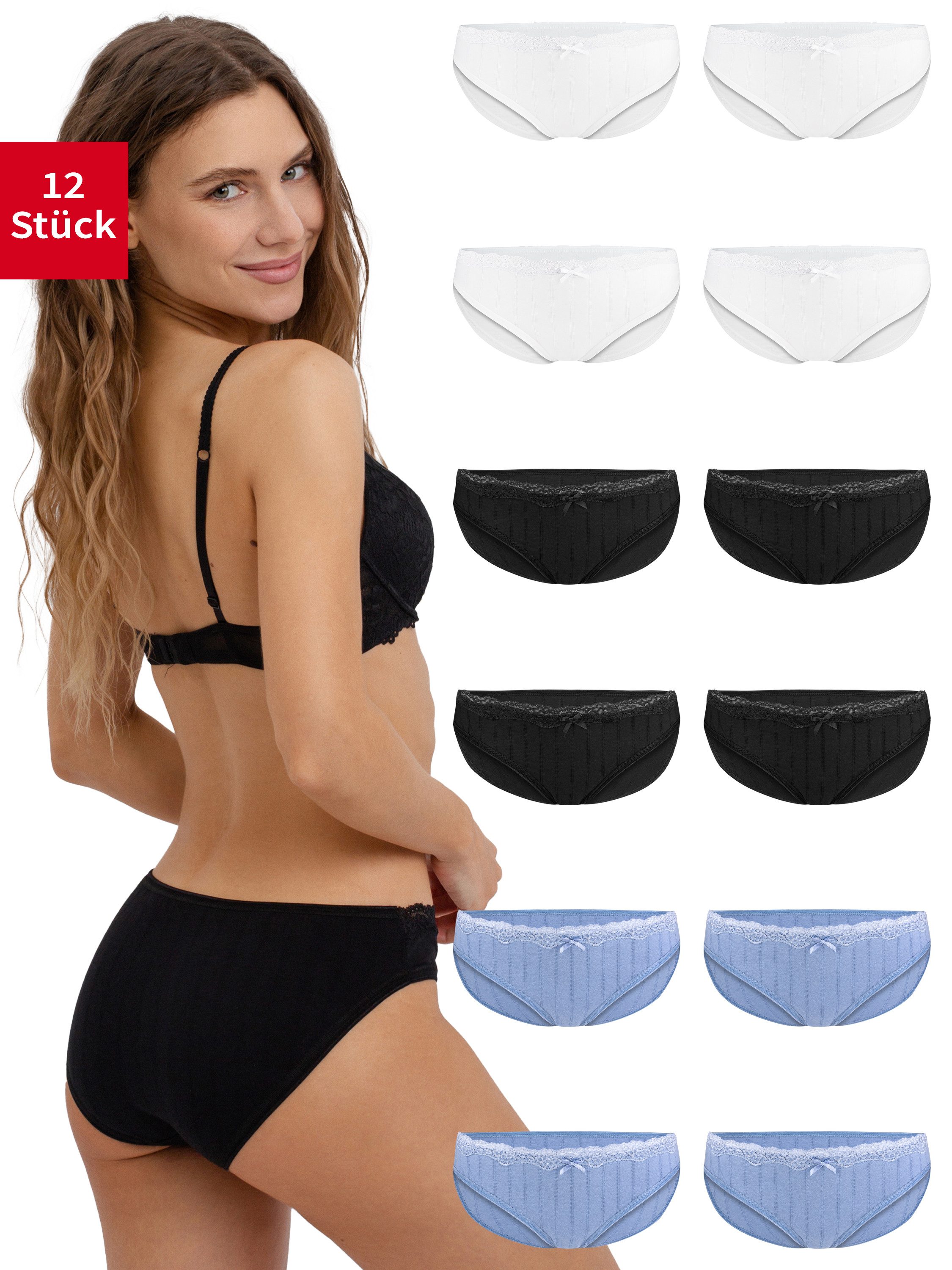 Die zarten Slips in drei tollen Farben setzen ganz auf Kontraste. Geschickt werden hier dezente Eleganz und eine sexy Attitude kombiniert. Mit ihrer geschmackvollen und zurückhaltenden Farbgebung in Schwarz, Hellblau und Weiß strahlen die Höschen ein stilvolles Selbstbewusstsein aus. Gleichzeitig setzt die fesche Spitzenbordüre am Bündchen eine tolle Auffälligkeit. Der feine Touch von frechem Sex-Appeal macht die Panties zu einem echten Hingucker. Besonders süß: Vorn ziert die Slips ein kleines Schleifchen.