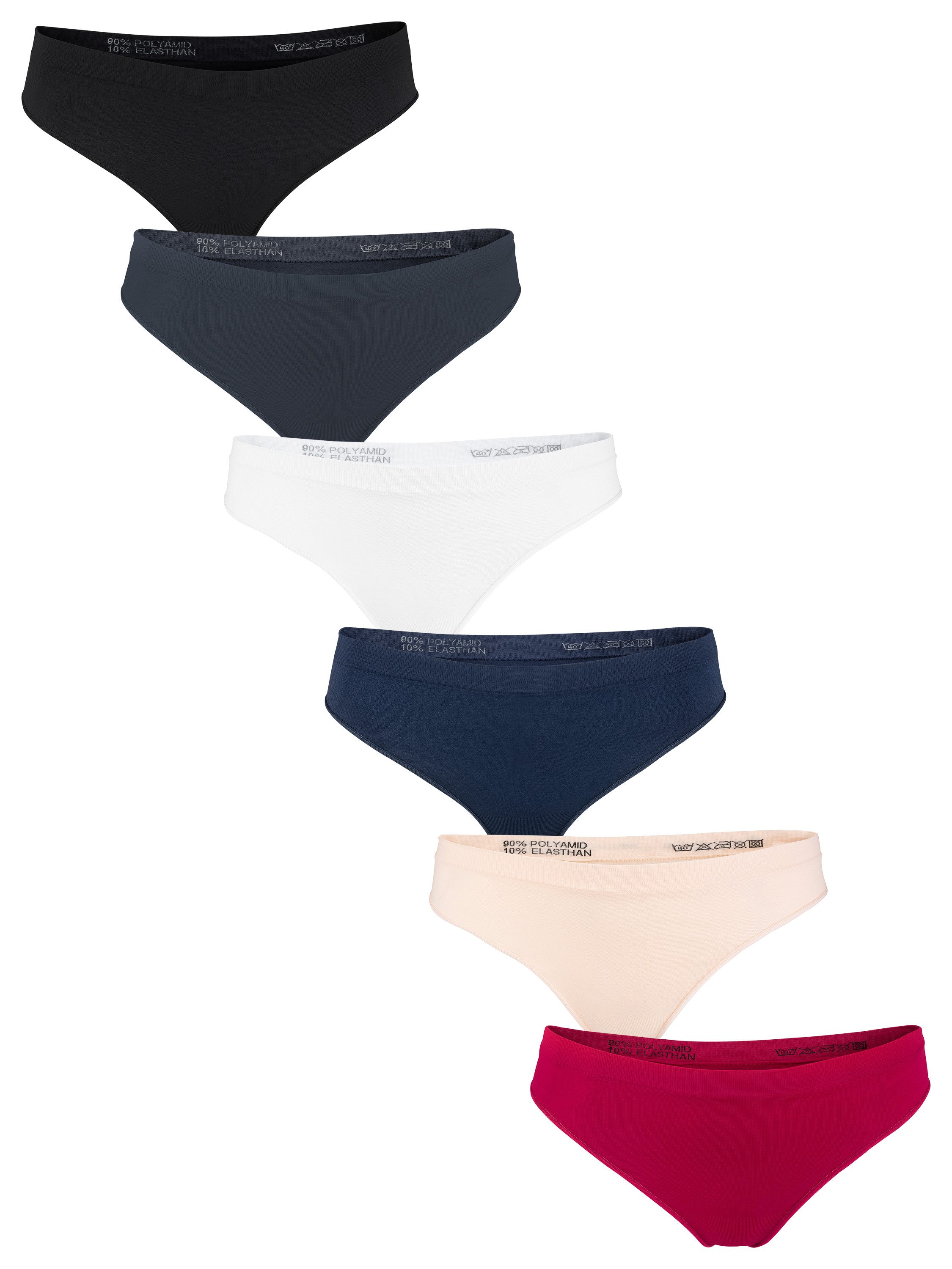 Oft braucht es gar keine romantisch-verspielten Details, aufwändige Drucke oder einen filigranen Spitzenbesatz, um Dessous zu außerordentlich sexy Wäschestücken zu machen. Diese modischen Damen-Höschen im hüftig sitzenden, modernen String-Fit zeigen, dass schon ein durchdachter Schnitt und eine gute Passform einen echt verführerischen Look kreieren können. Puristinnen greifen sicherlich spontan zu den schicken 6er-Sets mit den Modellen in elegantem Schwarz oder unschuldigem Weiß. Wer farblich auf etwas Abwechslung im Alltag steht, wählt den pfiffigen Farbmix mit sechs der attraktiven Höschen in Farbnuancen von Dunkelrot bis Schiefergrau.