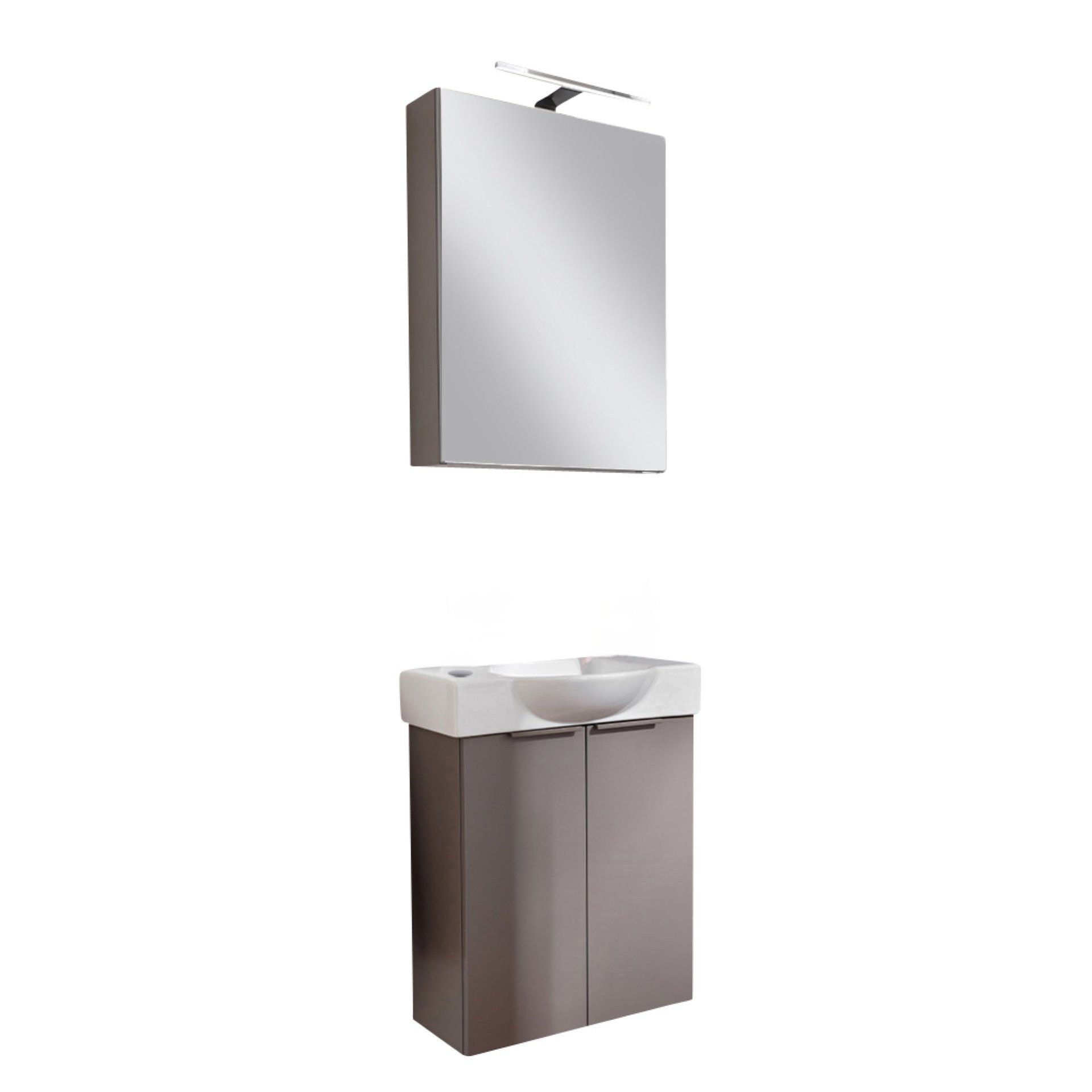 Der Waschbeckenunterschrank in edlem Grau bietet mit seinen zwei Türen und dem zusätzlichen Einlegeboden genügend Platz für Deine Badezimmerartikel. Die gedämpften Scharniere lassen die Türen sanft schließen und unterstreichen die Qualität dieses Möbelstücks. Eine kleine Ablagefläche rechts vom Waschbecken bietet zusätzlichen Platz für alltägliche Gegenstände wie Seifenspender.