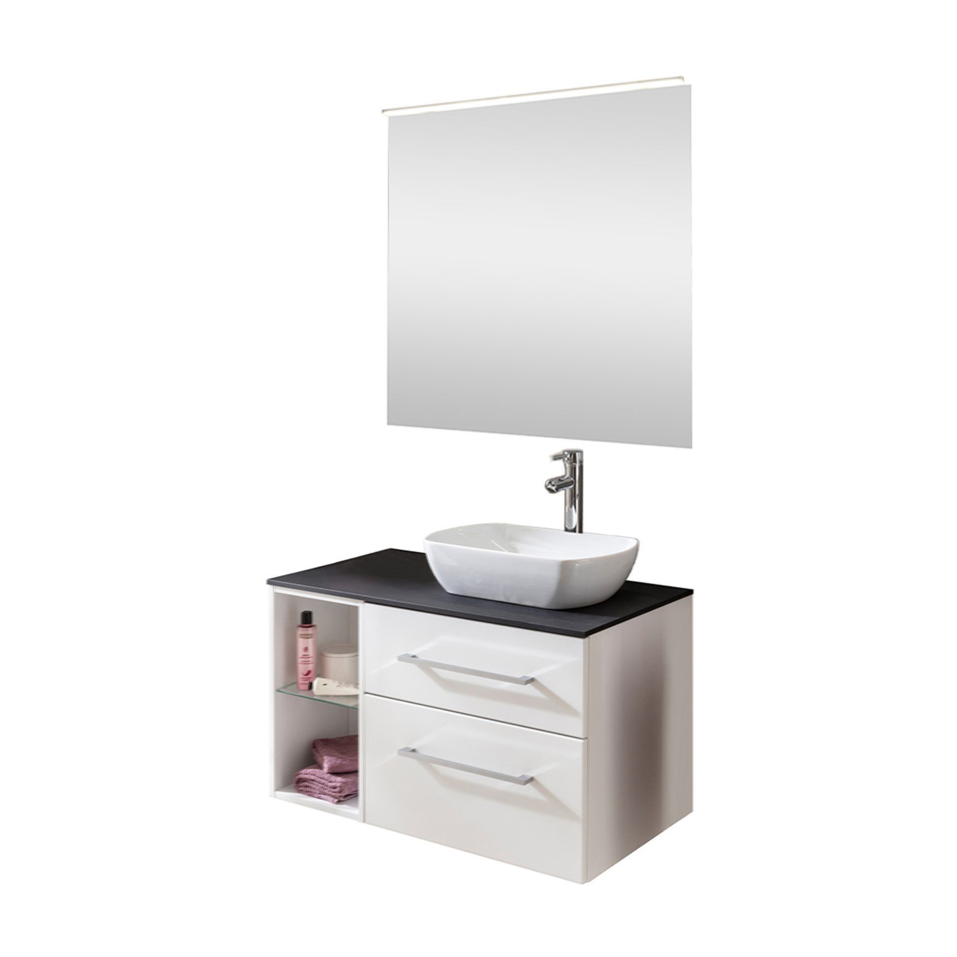 Das Badmöbel-Set OXFORD besteht aus sieben Komponenten: Das ovale Waschbecken mit chromglänzender Armatur ist ein Hingucker auf der schwarzen Waschtischplatte. Darunter sorgen der weiße Waschtischunterschrank und ein Regal für Stauraum. Der Spiegel mit LED-Aufsatzleuchte rundet das Set ab. Die in Deutschland hergestellten Möbel werden zerlegt und mit einer einfachen Anleitung zum Selbstaufbau geliefert.