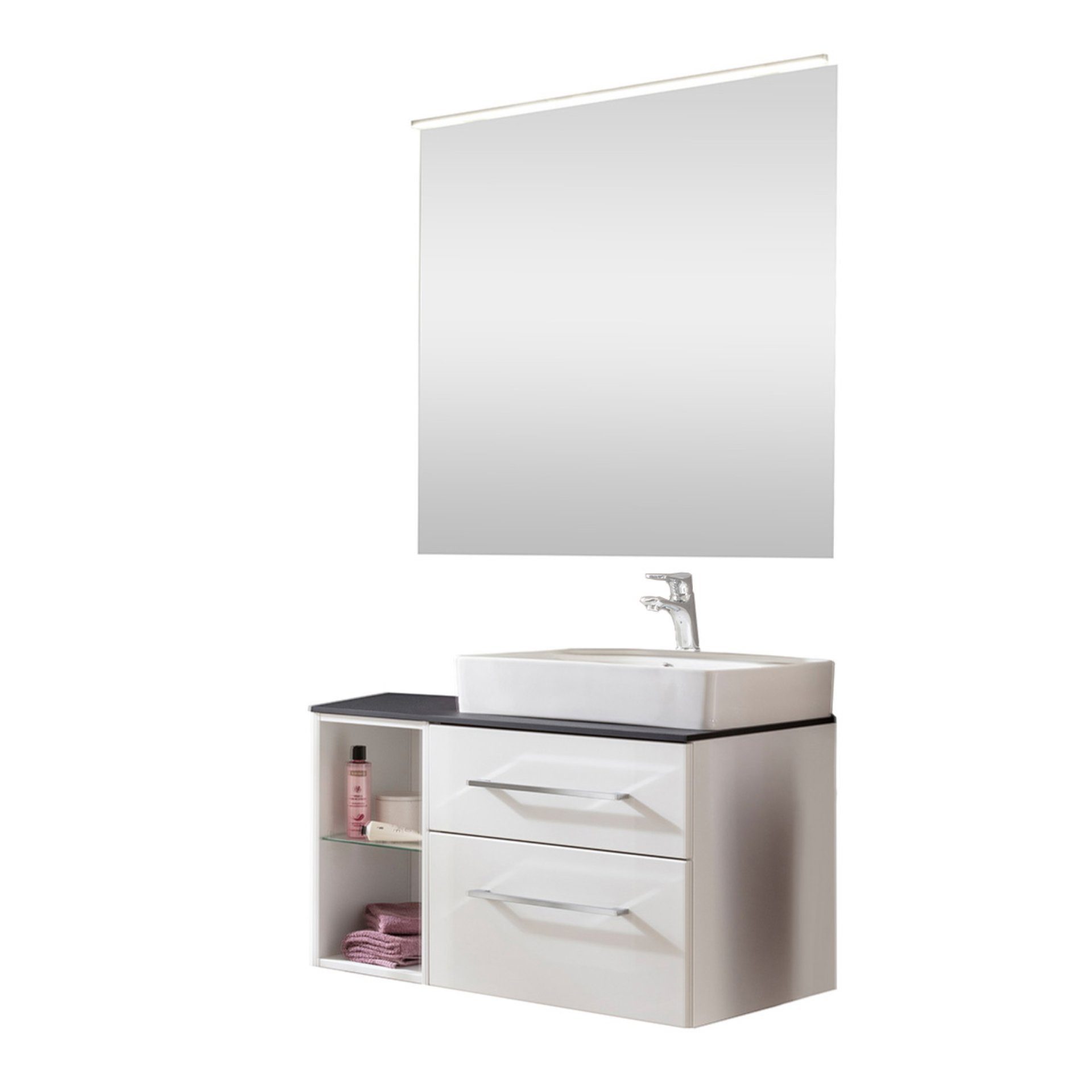 Das Badmöbel-Set OXFORD besteht aus sieben Komponenten: Das rechteckige Waschbecken mit chromglänzender Armatur ist ein echter Hingucker auf der schwarzen Waschtischplatte. Für Stauraum sorgen der weiße Waschtischunterschrank und ein ergänzendes Regal. Ein Spiegel mit Aufsatzleuchte rundet das Set ab. Die in Deutschland hergestellten Möbel werden zerlegt und mit einer einfachen Anleitung zum Selbstaufbau geliefert.