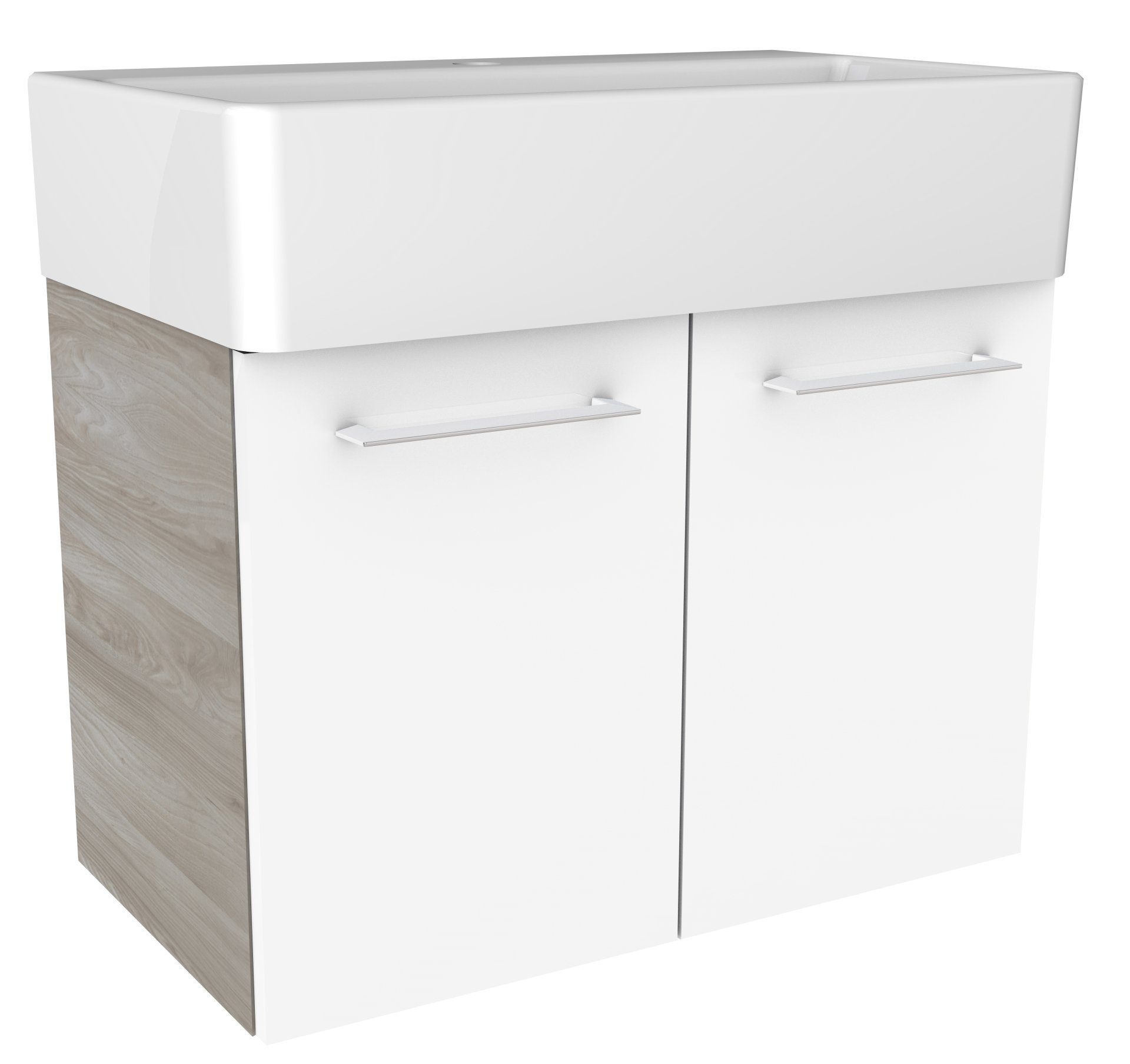 » 1. Waschtisch aus Keramik Maße (B x H x T): 60 x 13 x 35 cm, Material: Keramik, Farbe: Weiß » 2. Waschtischunterschrank Maße (B x H x T): 59 x 42 x 33 cm, 2 Türen, Korpus: Braun hell (Steinesche-Optik - feuchtraumoptimierte Holznachbildung), Front: Weiß(Hochglanz), Soft-Close