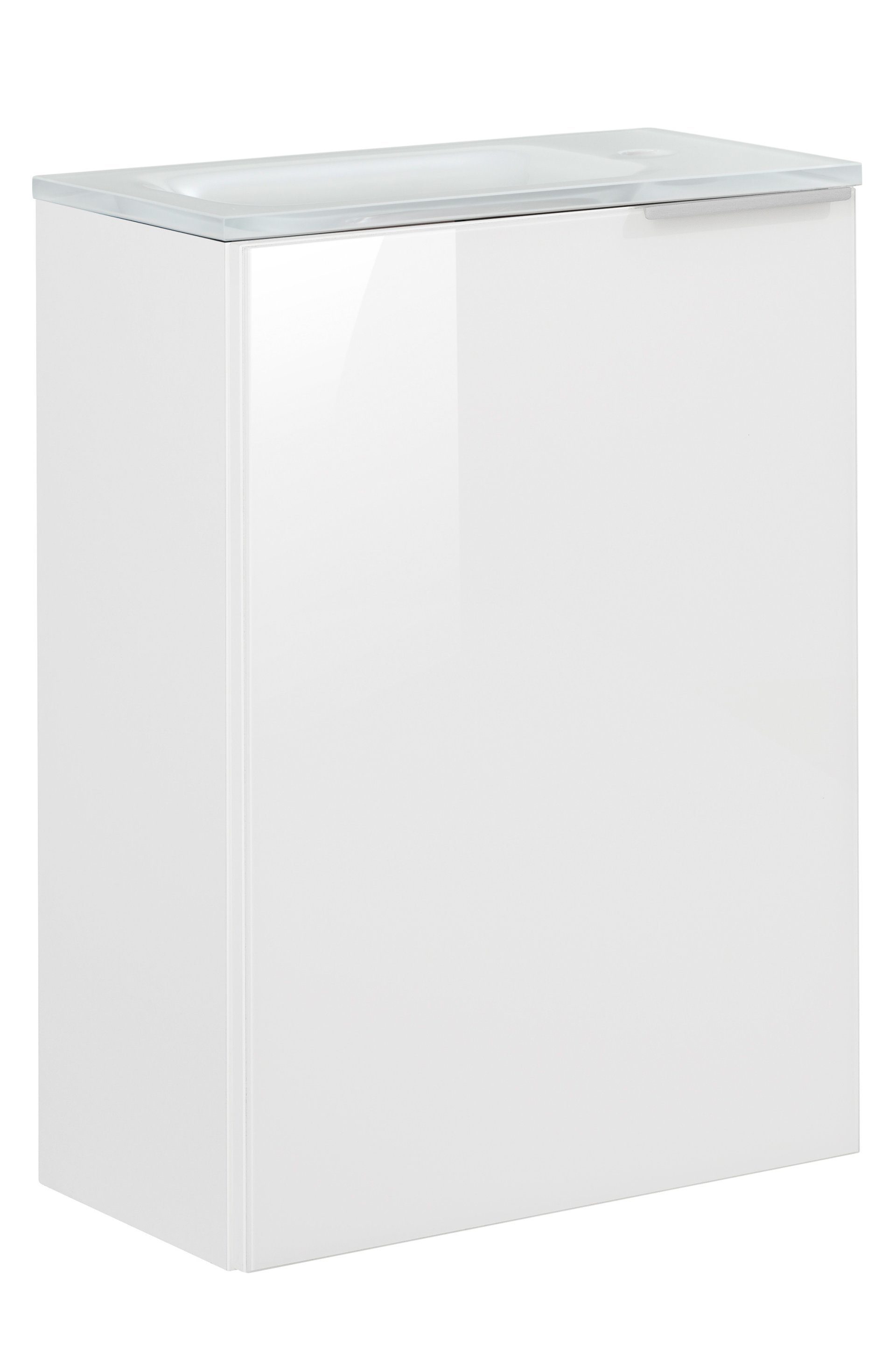 Perfekt fürs Gästebad: die Small Bathroom Collection – kurz SBC – von Fackelmann bietet eine große Auswahl an Möbeln, die speziell auf die Bedürfnisse kleiner Bäder und Gäste-WCs abgestimmt sind. Das harmonisch kombinierte Set mit 45 cm Breite besteht aus zwei Komponenten: Der Waschtischunterschrank in Weiß mit gläserner Front bietet hinter einer links angeschlagenen Tür auf einem Einlegeboden Stauraum für wichtige Badutensilien. Dazu kombiniert wird ein Waschbecken aus weißem Glas mit einem Platz für das Hahnloch auf der gewünschten Seite. Der Unterschrank wird vormontiert geliefert.