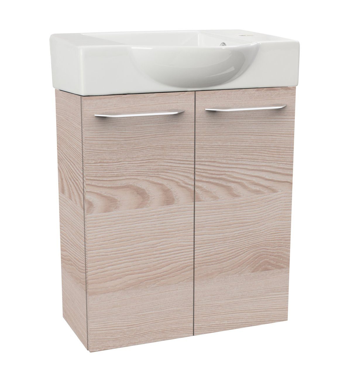 Das Möbel-Set von Fackelmann bietet eine Breite von 545 mm, was es besonders für räumlich begrenzte Badezimmer geeignet macht. Der Unterschrank und das Becken sind in einem schlichten Weiß gehalten, das sich nahtlos in jede Badezimmergestaltung einfügt. Die Fronten des Unterschranks sind ebenfalls in Weiß gehalten und sorgen für eine ruhige und reine Ausstrahlung. Die Türen des Unterschranks bieten praktischen Stauraum für Ihre Badezimmerutensilien.