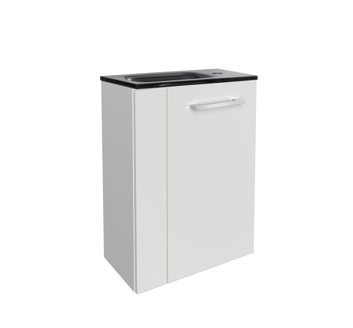 Das Möbel-Set besteht aus zwei Teilen: einem Unterschrank und einem Waschbecken. Der Unterschrank ist in einem schlichten Weiß gehalten, das sich nahtlos in jedes Baddesign einfügt. Die Fronten des Schranks sind ebenfalls in Weiß ausgeführt, was die klare Linienführung und das moderne Design unterstreicht. Das Becken aus hochwertigem Glas in Grau ergänzt den Unterschrank ideal und setzt einen eleganten Akzent im Raum.
