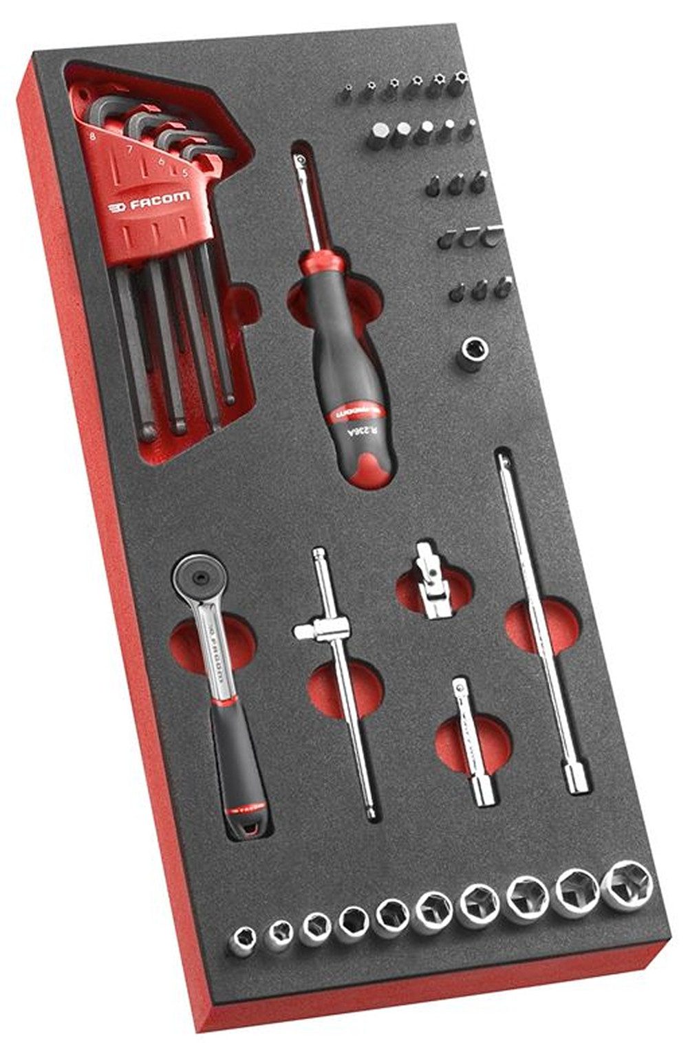 Facom MODM.R161-36 Modul Steckschluessel 1/4'''' R.161B 46tl Schaumstoffmodul Steckschlüssel 1/4'', 6-Kant, metrisch - 46 Teile - R.161B Produktstärken: Mit dem modularen Ordnungssystem von FACOM kompatibel:- Passend für Werkstattwagen CHRONO XL, CHRONO+, JET XL, JET+ und Kasten MBOX.L. Enthält: 1 Dichte Hochleistungs-Umschaltknarre 1/4'': R.161B. 10 Nüsse 1/4”, 6-Kant, metrisch: R. 5,5 - 6 - 7 - 8 - 9 - 10 - 11 - 12 - 13 - 14 mm. 2 Verlängerungen 1/4'': L 55 mm (R.209) - L 150 mm (R.215). 1 Kardan 1/4'': R.240A. 1 Gleitgriff 1/4'': R.120A. 1 Schraubendrehergriff 1/4'': R.236A. 1 Adapter für Steckschlüssel 1/4'' mit Standard-Federring für Einsätze 1/4'' - 6,35 mm: R.235. 20 Einsätze - Antrieb 1/4'' - 6,35 mm - L 25 mm: / EP.1T für Phillips®-Kreuzschlitzschrauben: PH1 - PH2 - PH3. / ED.1T für Pozidriv®-Kreuzschlitzschrauben: PZ1 - PZ2 - PZ3. / ES.1T für Schlitzschrauben: 4,5 - 6,5 - 8,0 mm. / EH.1 für metrische Innensechskantschrauben: 3 - 4 - 5 - 6 - 7 mm. / EXR.1 für Resistorx®-Schrauben: TT15 - TT20 - TT25 - TT27 - TT30 - TT40. 8 Stiftschlüssel mit Kugelköpfen, metrisch, im Satz (83SH.JP9A): 83SH. 1,5 - 2 - 2,5 - 3 - 4 - 5 - 6 - 8 -10 mm. Schaumstoffauflage (420 x 188 mm): PM.MODR1AN