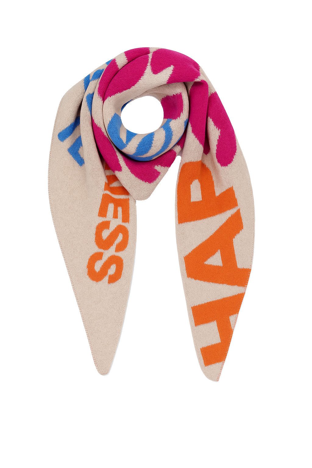 Trendiger Schal mit auffälligen Schriftzügen und farbenfrohem Design – ein echtes Statement-Piece.