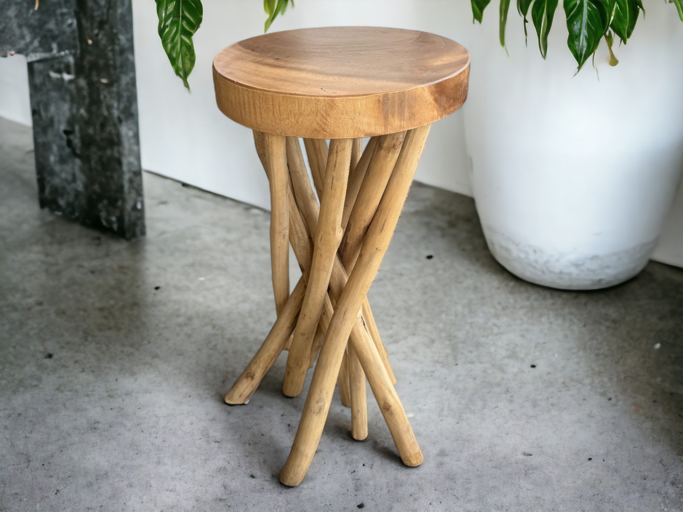 Maße: Höhe: 50 cm Breite: 28 cm Tiefe: 28 cm Material: Suar- und Teakholz Die runde Tischplatte besteht aus hochwertigem Holz, das die charakteristische Maserung von Suar und Teak aufweist. Diese natürlichen Holzarten verleihen dem Tisch eine warme und organische Ästhetik. Die Besonderheit dieses Beistelltisches liegt in seinen Beinen. Diese sind verzweigt und erinnern an organische Formen, wie Zweige oder Äste, die sich am Boden miteinander verflechten. Dieses Design verleiht dem Tisch eine einzigartige und künstlerische Note. Die Verbindung von Suar- und Teakholz sorgt für einen harmonischen Kontrast und macht den Tisch zu einem Blickfang in jedem Raum. Ob im Wohnzimmer, Schlafzimmer oder Flur – dieser Beistelltisch fügt sich nahtlos in verschiedene Einrichtungsstile ein. Er kann als Ablage für Bücher, Getränke, Dekoration oder als stilvolle Basis für eine Tischlampe dienen. Die Kombination aus natürlichen Materialien, handwerklicher Verarbeitung und einem außergewöhnlichen Design macht diesen Beistelltisch zu einem besonderen Möbelstück, das Funktionalität und Ästhetik perfekt vereint. Pflegehinweis: Um die natürliche Schönheit des Suar- und Teakholzes zu bewahren, empfehlen wir die regelmäßige Pflege mit farblosem Wachs oder Lack. Achtung: Bitte beachten Sie, dass es sich hierbei um Beispielbilder handelt - Der gelieferte Tisch kann vom Bild abweichen.