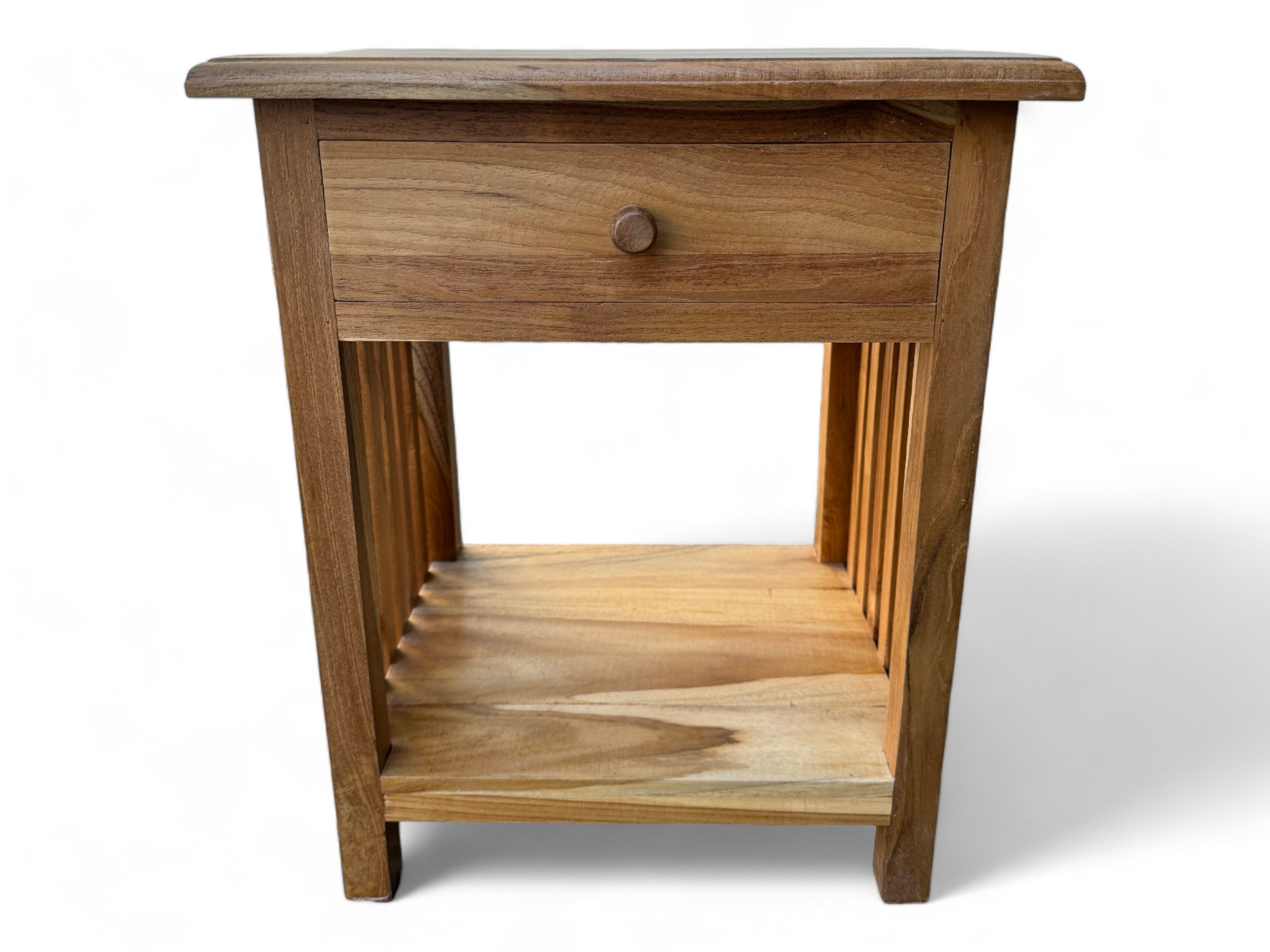 Erleben Sie den Charme vergangener Zeiten mit unserem exquisiten Nachttisch aus massivem Teakholz. Mit seinen kompakten Maßen von 45x40x30 cm fügt er sich mühelos in jedes Schlafzimmer ein und bietet eine perfekte Kombination aus Stil und Funktionalität. Unser Nachttisch besteht aus hochwertigem Teakholz, das für seine Robustheit und Langlebigkeit bekannt ist. Das Design ist schlicht und elegant, mit klaren Linien, die dem Stück einen modernen Vintage-Look verleihen. Die natürliche Maserung des Teakholzes verleiht jedem Nachttisch seinen eigenen einzigartigen Charme. Jeder Nachttisch ist ein handgefertigtes Unikat, was ihm eine besondere Note und individuellen Charakter verleiht. Die flache obere Fläche bietet ausreichend Platz für eine Lampe, Bücher oder dekorative Gegenstände. In der Mitte des Nachttischs befindet sich eine praktische Schublade, die mit einem runden Griff versehen ist und Stauraum für kleinere Gegenstände wie Lesebrillen oder Notizbücher bietet. Unterhalb der Schublade finden Sie ein offenes Fach, ideal zur Aufbewahrung von größeren Gegenständen wie Bücher, Tablets oder anderen Utensilien, die Sie in Griffweite haben möchten. Dieser vielseitige Nachttisch eignet sich nicht nur für Ihr Schlafzimmer. Nutzen Sie ihn als stilvollen Beistelltisch im Wohnzimmer, im Büro oder sogar im Flur. Egal, wo Sie ihn platzieren, er wird stets durch seine Funktionalität und ästhetische Anziehungskraft bestechen. Holen Sie sich dieses stilvolle und praktische Möbelstück und verwandeln Sie Ihr Zuhause in eine Wohlfühloase.