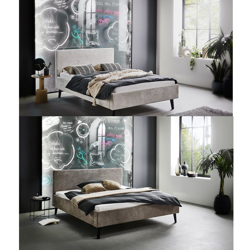 Der Stoffbezug, sorgfältig ausgewählt für seine angenehme Haptik und visuelle Ansprechbarkeit, umhüllt das Bettgestell geschmeidig. Das Material fühlt sich weich an und verleiht dem Bett eine behagliche Ausstrahlung. Die Bettrahmen Struktur sowie die Bettfüße bestehen aus massivem Eichenholz, das nicht nur für Robustheit, sondern auch für zeitlose Eleganz steht. Die Details des Bettgestells, wie fein gearbeitete Nähte und sorgfältig abgestimmte Proportionen, unterstreichen die handwerkliche Qualität des Designs. Der stilvolle Stoffbezug verleiht dem Bett nicht nur eine warme Note und setzt damit Akzente im Raum, sondern lädt auch dazu ein, den Alltagsstress hinter sich zu lassen.