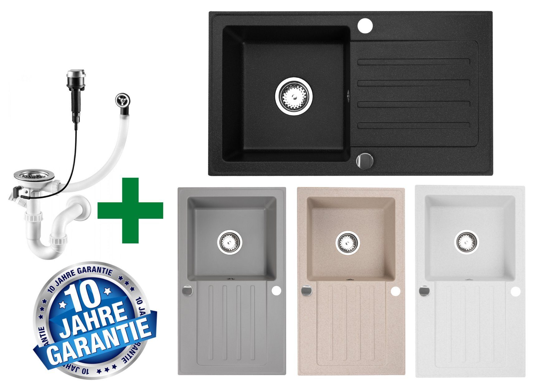 Lieferumfang: Granitspüle, Siphon, Anschlussschläuche, Befestigungsmaterial und Originalverpackung.