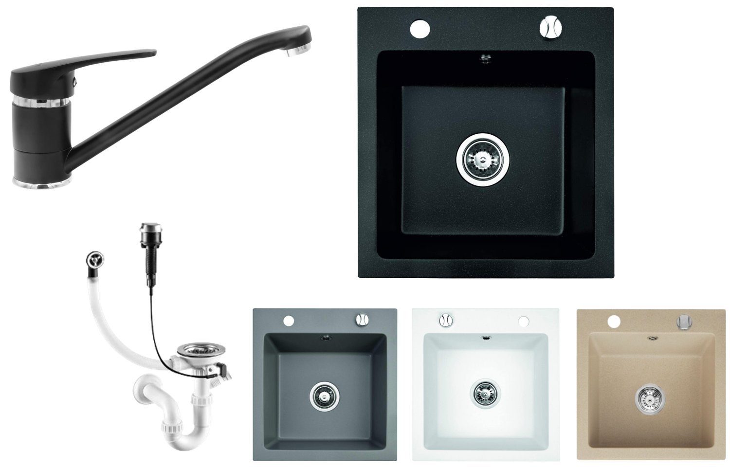 Описание товара (мы ещё работаем над переводом, извините за неудобство) Auf der Suche nach einer neuen Spüle, passend zu Ihrem Dekor und dazu noch qualitativ hochwertig mit einer ebenso hohen Langlebigkeit? Reversibel einsetzbare und Qualitativ hochwertige Granitspülbecken Mit unseren eleganten und hochwertigen Granitspülen können Sie nichts verkehrt machen. Sie sind reversibel einbaubar und für den Privaten sowie auch für den gewerblichen Gebrauch super geeignet. Sehr Langlebiges Spülbecken mit Abtropffläche Unter rauen Bedingungen und täglichem Einsatz hält die Einbauspüle, was Sie verspricht. Sie lässt sich sowohl in modernen als auch traditionellen Umgebungen top einbauen. Mit den vorgebohrten Löchern für eine Armatur und dem enthaltenen Siphon Set können Sie Ihre Spüle sofort anschließen und das Becken beidseitig montieren. Herstellung EU Unsere Küchenspülen werden nach der Europäischen Norm für Sie hergestellt. Sonstige Daten/Highlights: - Maße d. Spülbecken: 48x16x50cm (BxHxT) - Form: Eckig - Farbe: Matt Beige/Grau/Schwarz/Weiß - Gewicht: ca. 13,5 kg Maße der Armatur: - Gesamthöhe 53,5 cm - Höhe bis Auslauf 17cm - Die Reichweite des Auslaufs von der Mitte der Armatur beträgt 24,5 cm - Hitzebeständig bis zu 280°C - Material: 80% Quarzanteil; 20% Acrylharz mit Farbpigmenten - Kratzfest und Resistent gegen chemische Substanzen - vorgebohrte Löcher - Reversibel - langlebig unter rauen Bedingungen - Abtropffläche - elegant & qualitativ hochwertig - großes Becken - Mit unseren Armaturen kombinierbar - Für Unterschränke ab 45 cm Lieferumfang: - Spüle - Armatur - Inkl. Markenhaftes Siphon Set (inkl. Anschluss für Wasch,- oder Geschirrspülmaschine)