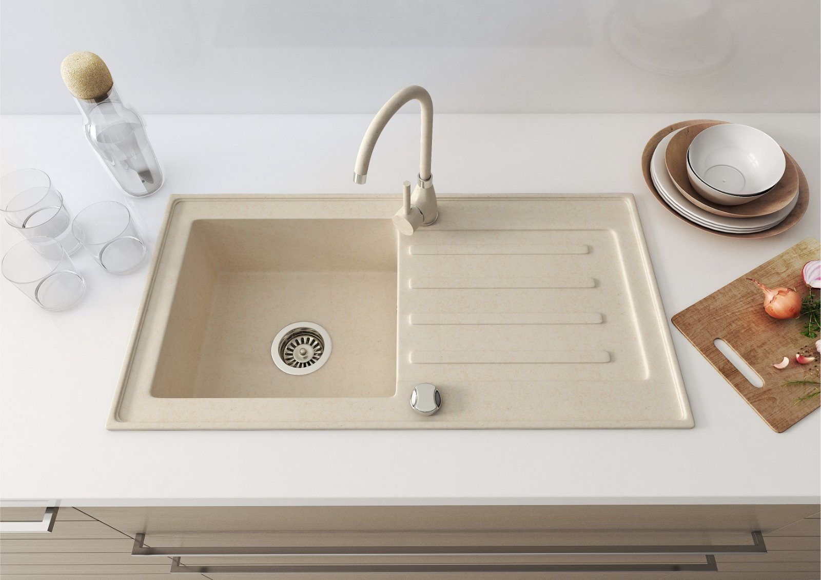 Es handelt sich um eine hochwertige Graniteinbauspüle im modernen Stil, die sowohl für private als auch gewerbliche Küchen und Bars geeignet ist. Mit dem neuen Design der Granitspüle erhalten Sie eine sehr belastbare und langlebige Spüle für den täglichen Einsatz, auch unter rauen Bedingungen. Außerdem ist sie einfach zu installieren, zu reinigen und zu bedienen. Unsere qualitativ hochwertigen Granitspülen passen sowohl in moderne als auch in traditionelle Umgebungen hervorragend.