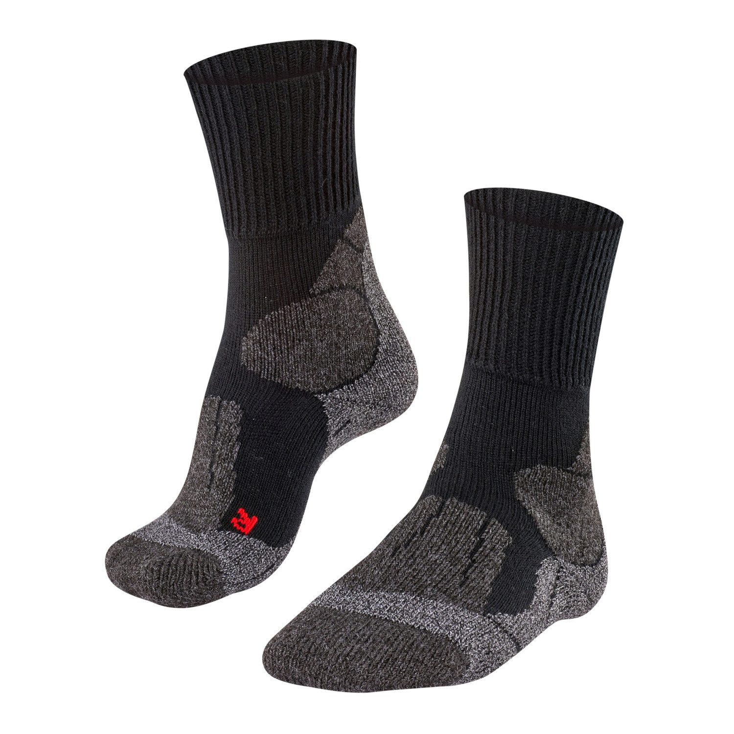 Mit ihrer extra starken Polsterung und ihrem Merinowoll-Mix sorgt die Wandersocke ""TK1"" für maximalen Schutz und gute Wärmeisolation bei ausgiebigen Bergtouren unter jeglichen Wetterbedingungen. Schneller Feuchtigkeitstransport sowie die gute Passform garantieren Temperatur und hohen Komfort am Fuß. Die Wandersocken für das Hochgebirge aus geruchshemmender, atmungsaktiver Wolle und Funktionsmaterial halten Ihre Füße aufgrund der 3-lagigen feuchtigkeitsabsobierenden Sohlenkonstruktion trocken. Die starke Polsterung an den Belastungszonen der Thermosocken für anspruchsvolles, bergiges Gelände bieten Ihnen hohen Tragekomfort; die flache Zehennaht verhindert Druckstellen, Reibung und Blasen. Ob Trekking- oder Bergtouren- die Trekkingsocken bieten Ihnen festen Schuhkontakt und eine hohe Dämpfung in Bergstiefeln (Schuhkategorien B-C); bei Zwischengrößen empfehlen wir die kleinere Größe. Spezielle geschlechtsspezifische Strickverfahren, die auf die anatomischen Unterschiede Ihres rechten und linken Fußes abgestimmt sind, sorgen für hohen Tragekomfort und eine faltenfreie Passform. Die hochwertige Merinowolle wärmt bei kalten und kühlt bei warmen Temperaturen Ihre Füße; die Ganzjahreswandersocken begleiten Sie bei Ihren Outdooraktivitäten bei allen Wetterbedingungen. Das Familienunternehmen FALKE, gegründet 1895, basiert auf festen Werten: Bedingungslose Qualität, höchste Handwerkskunst, innovative Artikel und plastikfreie Verpackung. Material: 44% Polypropylen, 25% Polyacryl, 20% Schurwolle, 10% Polyamid, 1% Elasthan.