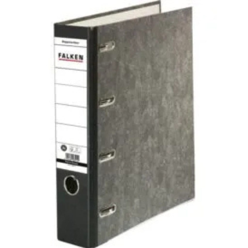 Dieser Doppelordner mit Wolkenmarmorbezug überzeugt durch seine hochwertige Hebelmechanik, ein Griffloch, Kantenschutz und Schlitze.