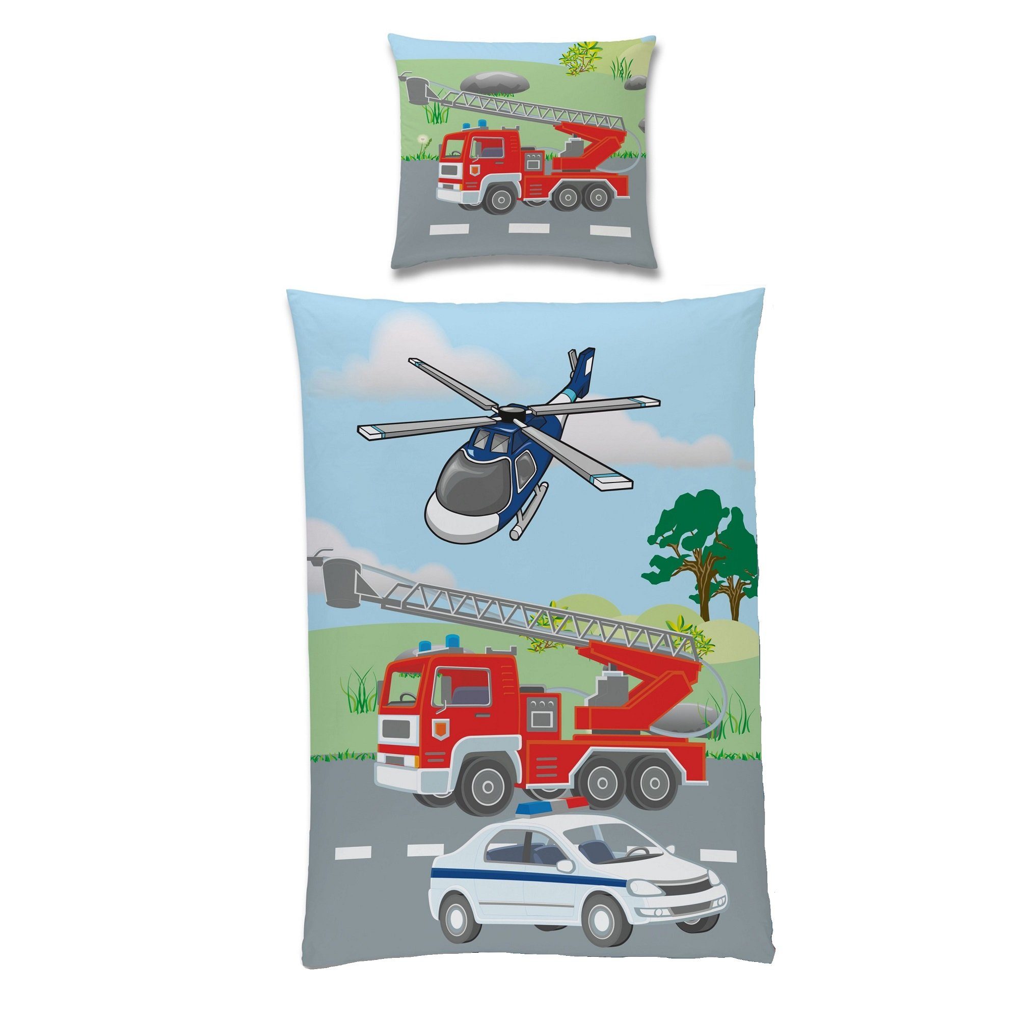 DESIGN: Schöne Kinderbettwäsche mit Wendeseite in kräftigen Farben blau grau · Vorderseite mit Polizei- & Feuerwehrauto und Helikopter · Kopfkissen mit Wendemotiv