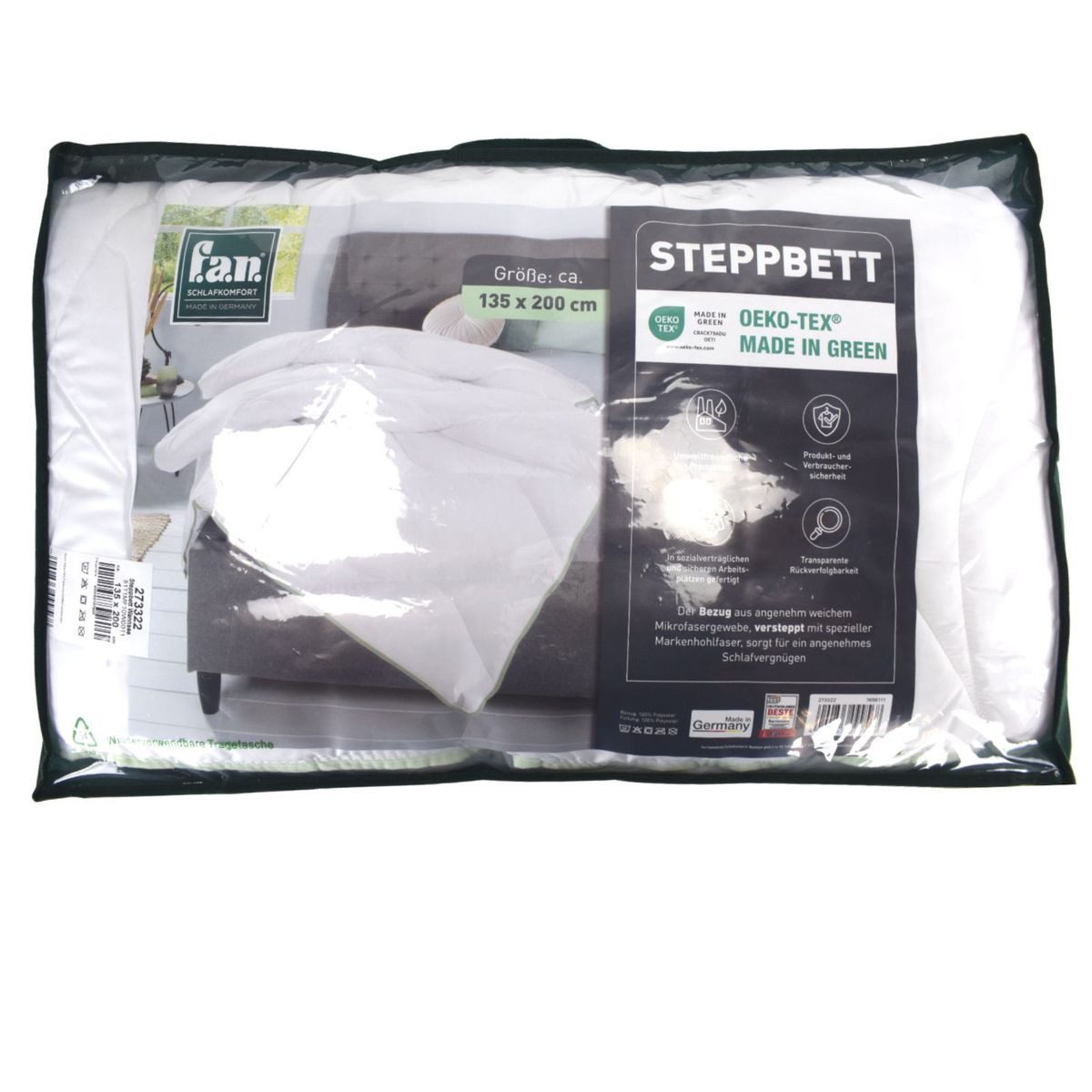 Steppbettdecke "Wannsee" der Marke F.A.N., mit einer Bemaßung von ca. 135 x 200 cm. Geliefert in einer praktischen und wiederverwendbaren Staubschutztasche mit Tragegriffen. Hergestellt aus Mikro- und Hohlfasern, die aus 100 % Polyester zusammengesetzt wurden. Optisch ansprechendes Stepp-Muster mit klassischer weißer Farbgebung. Für bis zu 60°C Maschinenwäsche geeignet. Nicht in den Trockner geben. Feinwaschmittel verwenden.