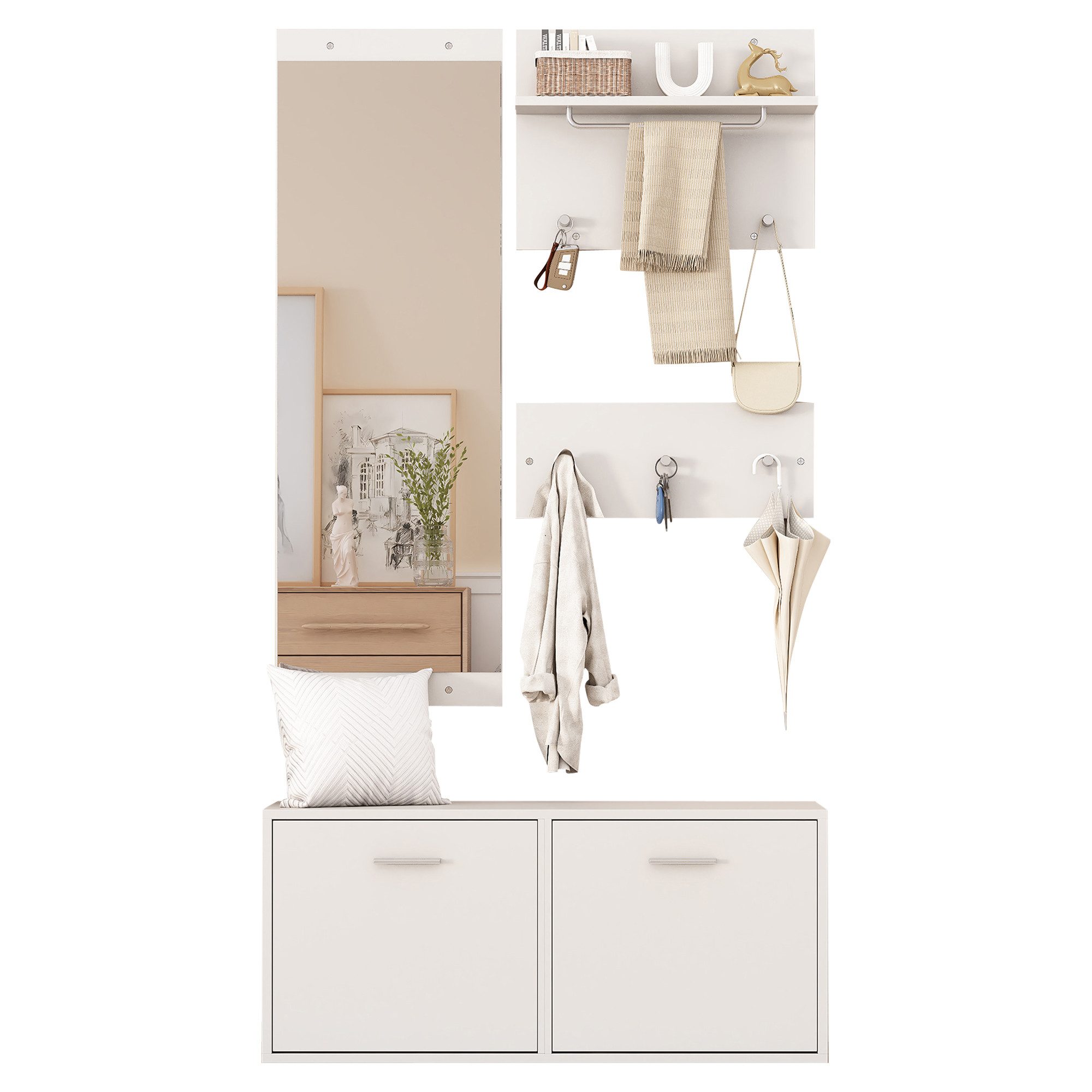 Dieses komplett-Set vereint zwei Wandgarderoben, einen doppelstöckigen Schuhschrank mit Sitzfunktion und einen platzsparenden Wandspiegel zu einer harmonischen Eingangslösung. Im reinweißen Farbton fügt es sich perfekt in moderne Wohneinrichtungen ein und schafft eine aufgeräumte Empfangszone.